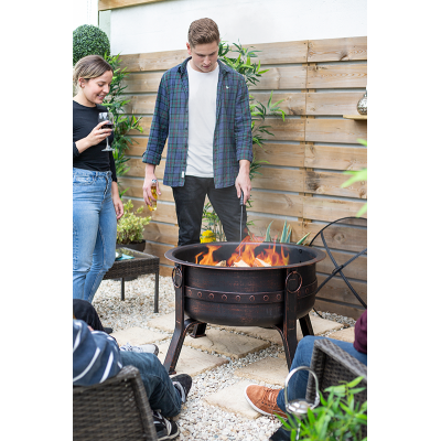 Необычный дизайн, прочная круглая чаша, установленная на подставке с четырьмя крепкими ножками. Бронзовая отделка с декоративными заклепками создает ощущение прочности и надёжности. Чаша выполнена из температуроустойчивой стали высокого качества. У очага Brava имеется крышка с сеткой, которая используется для большей безопасности как искрогаситель.