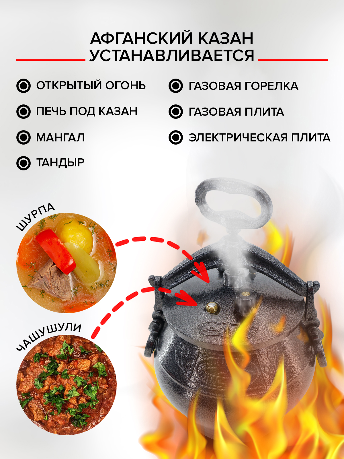 Афганский казан — это разновидность казана с герметично закрывающейся крышкой. Благодаря герметичной крышке при работе во внутреннем объёме афганского казана образуется повышенное давление, которое приводит к повышению температуры кипения воды внутри казана. В результате этого продукты готовятся при более высокой температуре, чем в обычном казане. Это приводит к значительному сокращению времени готовки. Так как пища не окисляется на воздухе под воздействием тепла, то сохраняется яркий цвет приготовленных овощей.