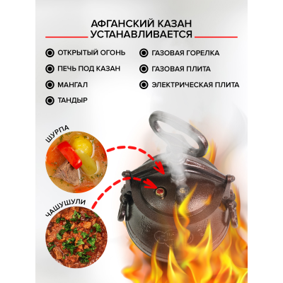 Афганский казан — это разновидность казана с герметично закрывающейся крышкой. Благодаря герметичной крышке при работе во внутреннем объёме афганского казана образуется повышенное давление, которое приводит к повышению температуры кипения воды внутри казана. В результате этого продукты готовятся при более высокой температуре, чем в обычном казане. Это приводит к значительному сокращению времени готовки. Так как пища не окисляется на воздухе под воздействием тепла, то сохраняется яркий цвет приготовленных овощей.