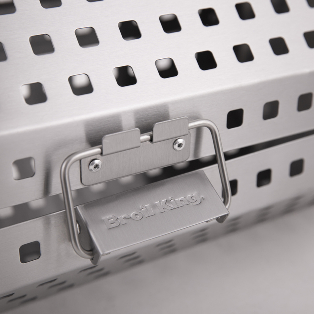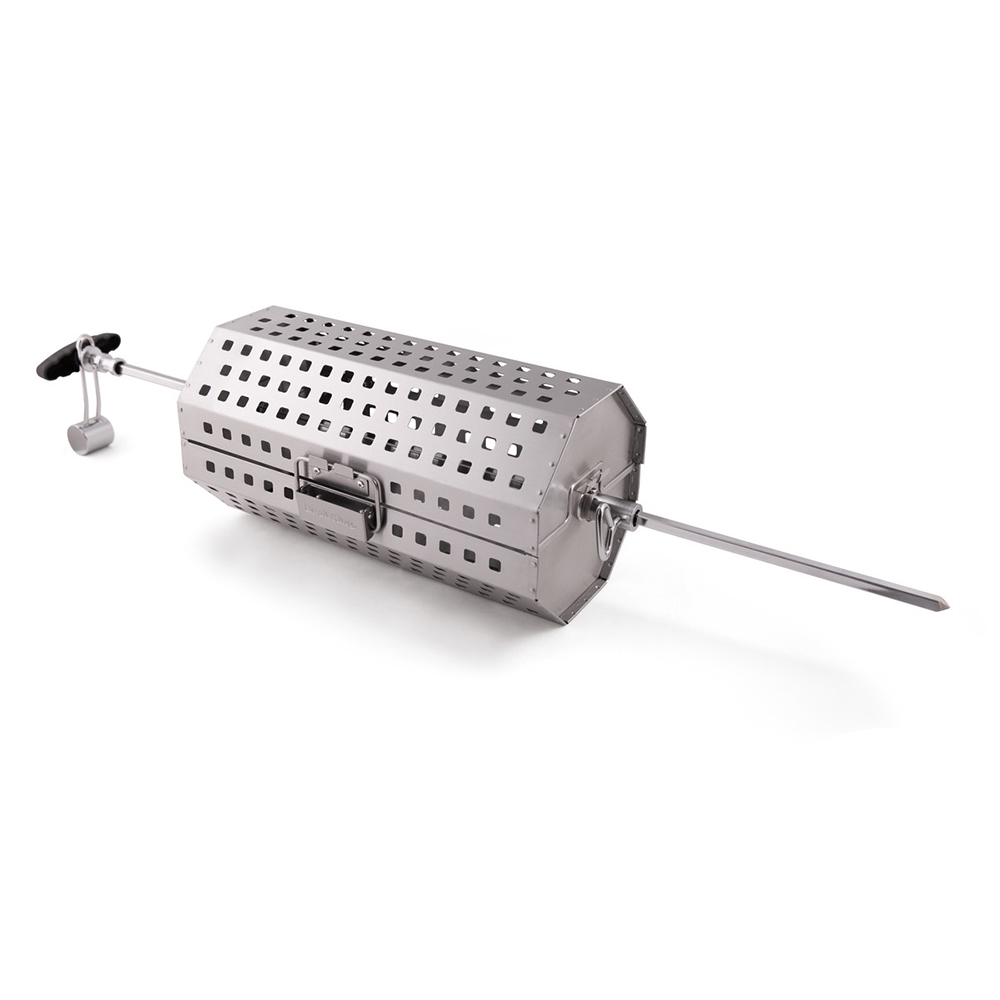 Перфорированная корзина для гриля изготовлена из высококачественной нержавеющей стали. С её помощью можно готовить на гриле нежные блюда, используя вертел для гриля. Корзина идеально подходит для крылышек и овощей, не допуская пригорания. Верхнюю часть корзины можно снять и использовать в качестве гриля вок.