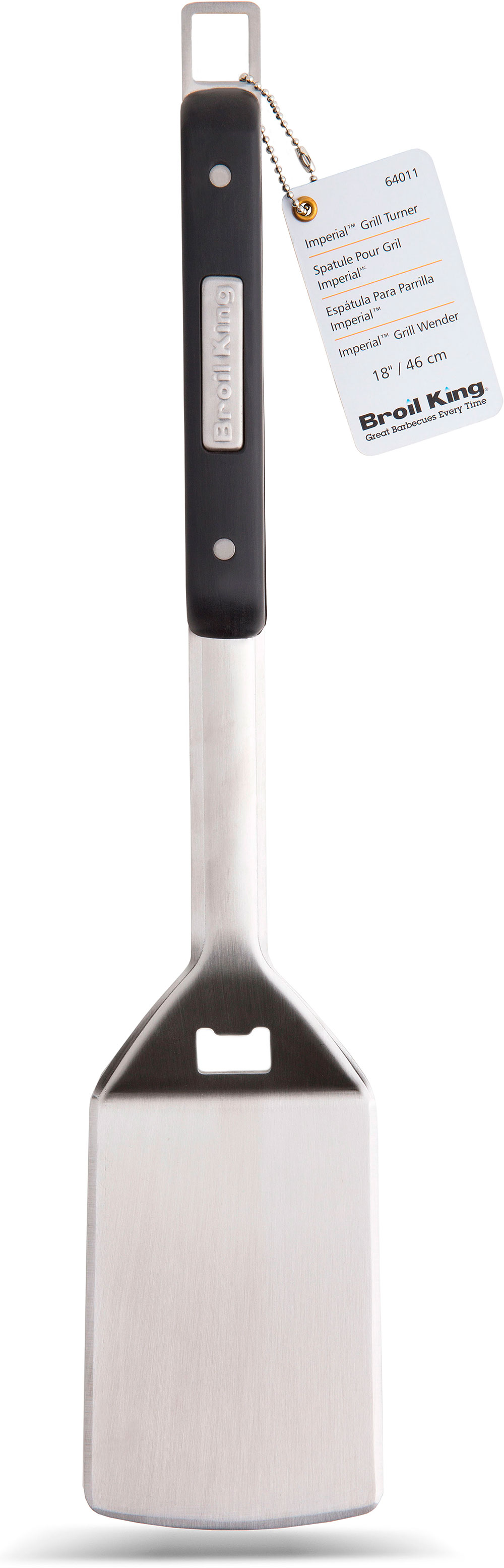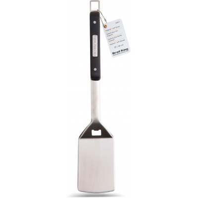 Лопатка Broil King изготовлена из высококачественной нержавеющей стали и имеет встроенный ключ для открывания бутылок, крючок и прочную каучуковую рукоятку с логотипом Broil King из нержавеющей стали.
