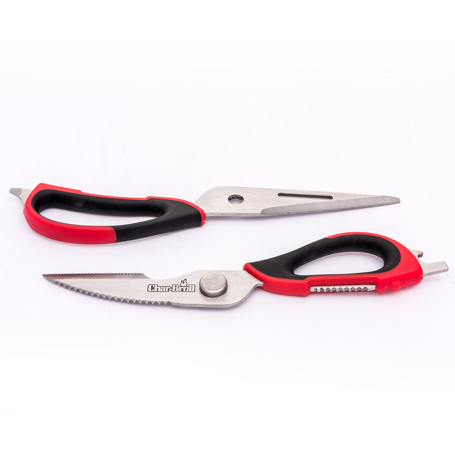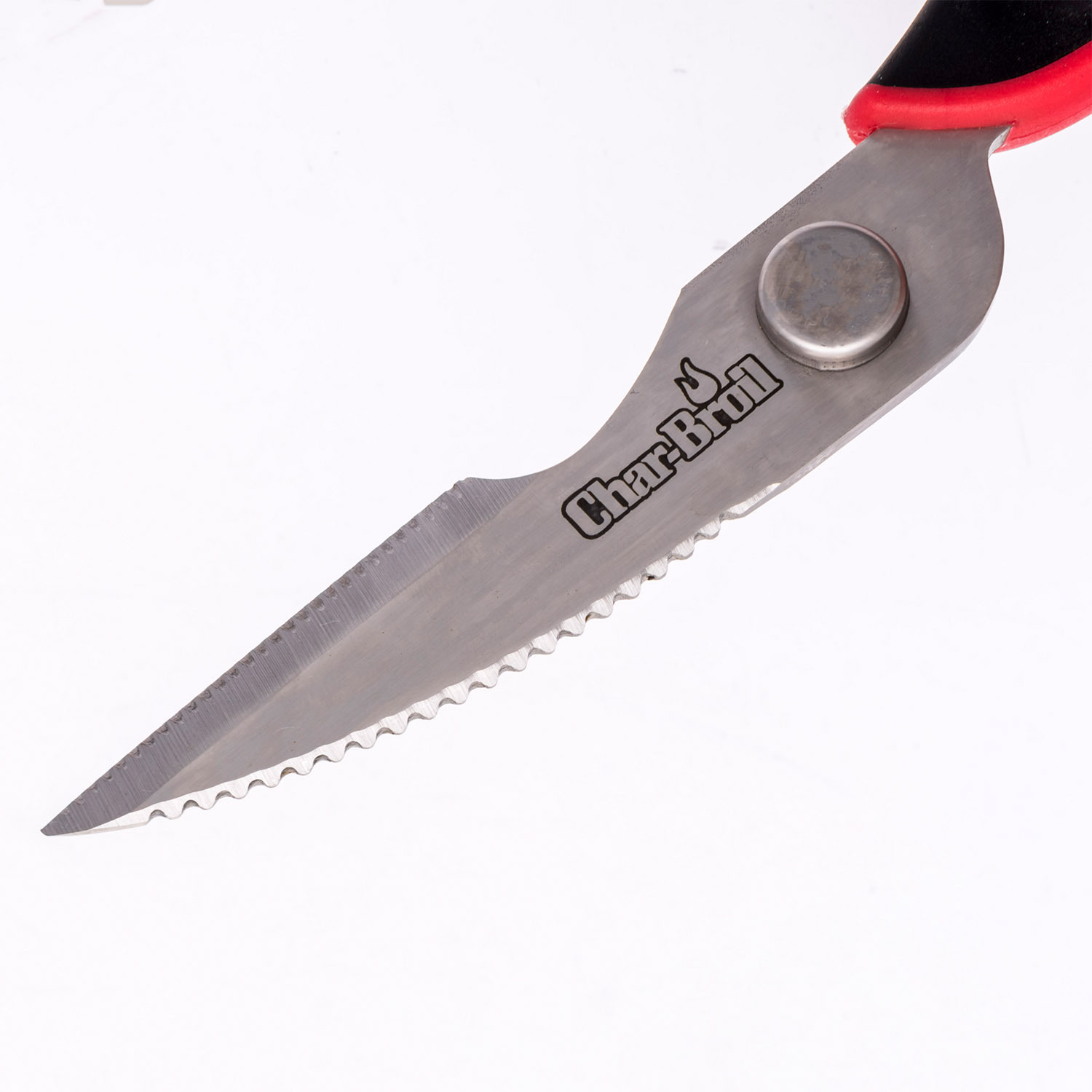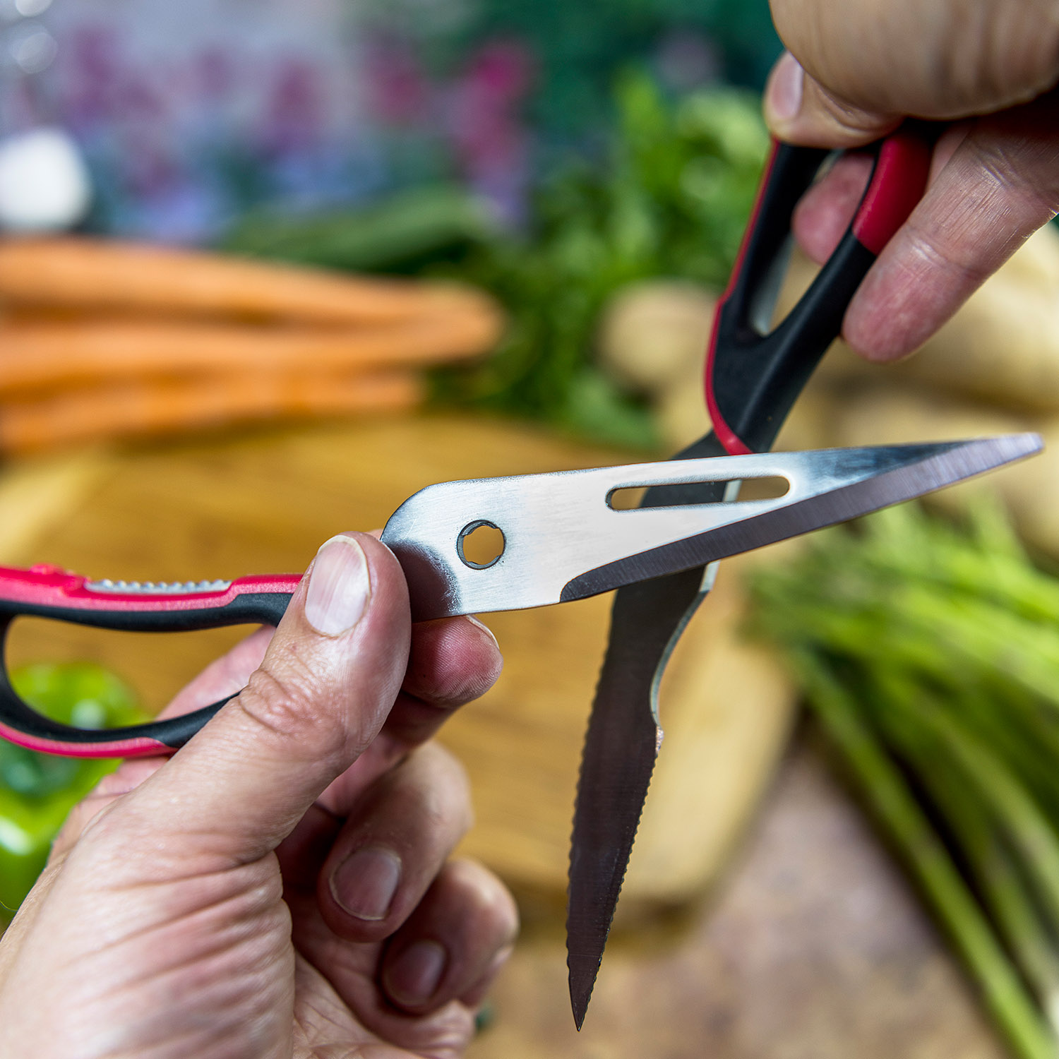 Ножницы для мяса с комфортным захватом — это универсальный инструмент, который идеально подходит для готовки мяса, разрезания костей или вскрытия скорлупы. Эти ножницы для мяса с лезвиями из нержавеющей стали и удобной ручкой для захвата имеют встроенный открыватель для бутылок, щелкунчик для орехов, захват и отвертку с плоской головкой для множества применений. Ножницы подходят для мытья в посудомоечной машине.