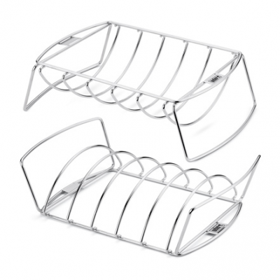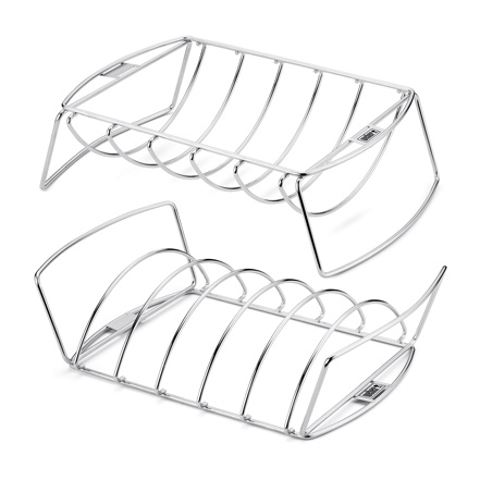 Подставка позволяет эффективно использовать место на решётке гриля. Повернутая одной стороной она вмещает внушительный кусок говядины или свинины, а если ее перевернуть, то в вашем распоряжении будет емкий держатель для рёбрышек. Такая конструкция 2-в-1 позволяет существенно расширить возможности приготовления, и одновременно минимизировать используемое пространство.