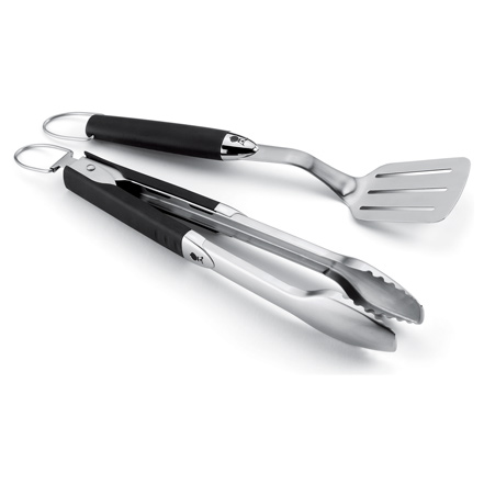 Лопатка и щипцы – самые необходимые инструменты для работы с грилем. Практичный набор инструментов, который включает в себя щипцы и лопатку для удобного переворачивания продуктов небольшого размера. Выполнены аксессуары из высококачественной нержавеющей стали с ручками из силикона. У лопатки и щипцов есть специальные петли, за которые их можно подвешивать на гриль, чтобы они всегда были под рукой.