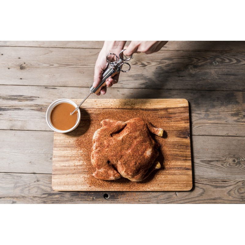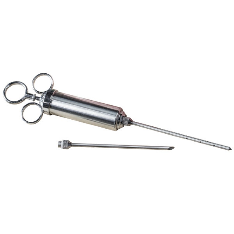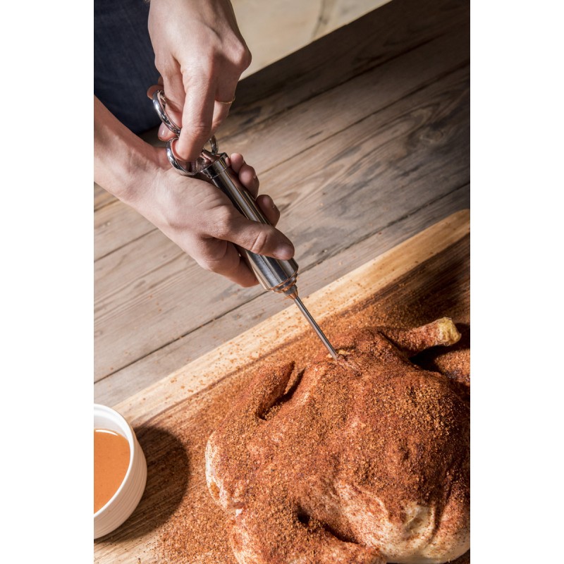 Наполните ваше мясо новым вкусом. Долговечный шприц из нержавеющей стали с объёмом до 60 мл идеально подходит для маринования. В комплект входят две насадки — для жидкого маринада и для маринада или измельченных продуктов (лука, перца и т.п.).
