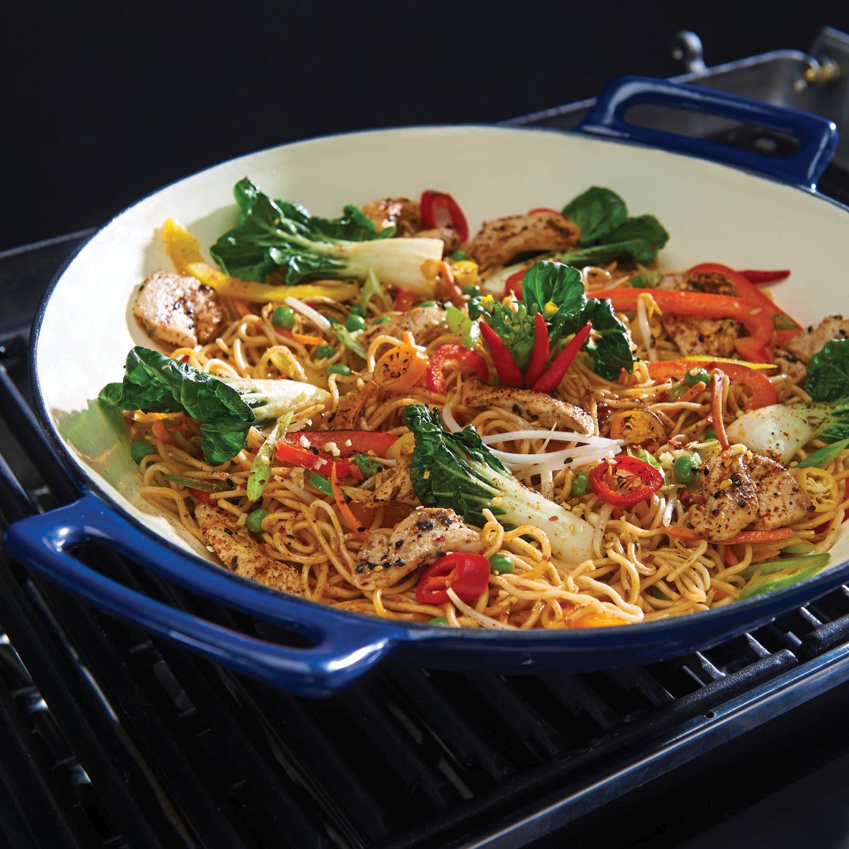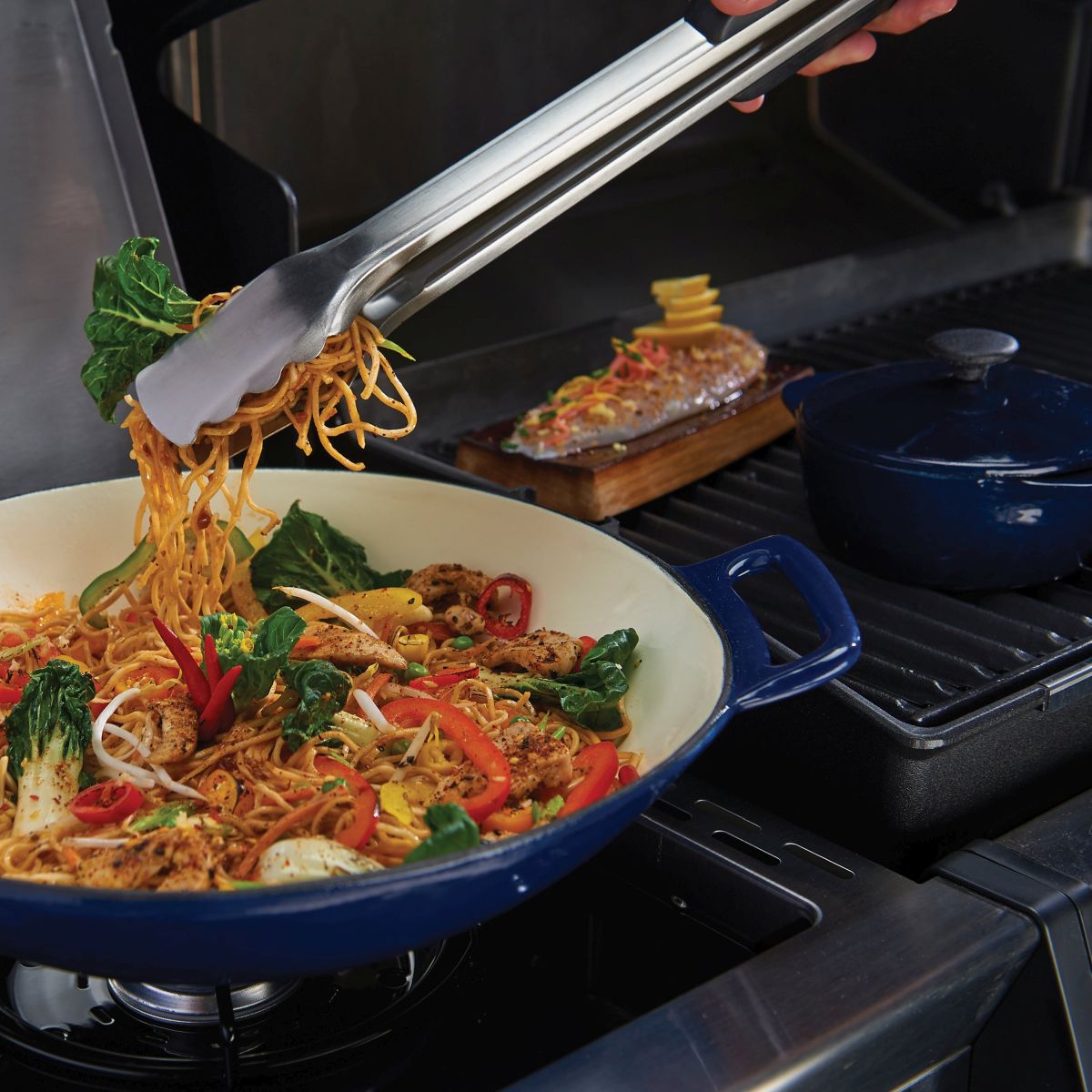 Прочное фарфоровое покрытие на чугунном основании делает этот вок для гриля одним из самых популярных аксессуаров. Его очень легко чистить; кроме того, он обеспечивает постоянную прожарку благодаря способности чугуна удерживать и равномерно распределять тепло. Диаметр – 36 см, глубина – 9,5 см.