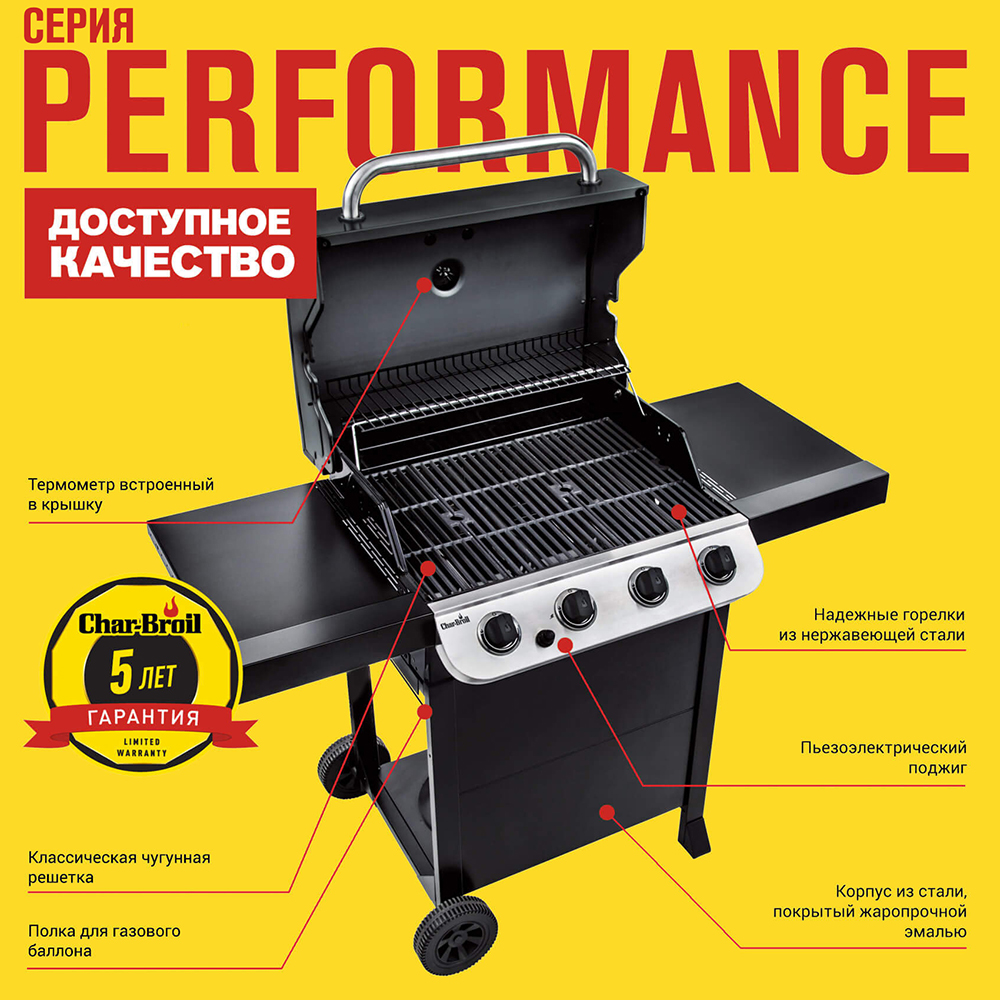 Традиционные грили Char-Broil из линейки Performance series с классической чугунной решёткой имеют на борту всё, что требуется для настоящего барбекю на открытом воздухе.