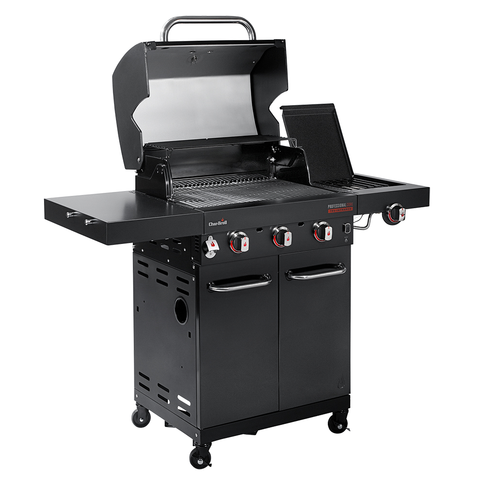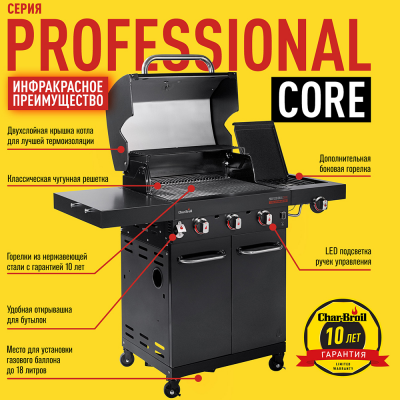 Новейшие газовые грили Char-Broil серии Professional третьего поколения, являются самыми популярными моделями в США, Европе и по всему миру. Газовые грили Professional оснащаются запатентованной инфракрасной пластиной TRU Infrared, которая обеспечивает равномерный жар по всей решётке и предохраняет от вспышек капающего жира в котле. Эта сбалансированная модель среднего размера с тремя основными и дополнительной боковой горелками прекрасно подойдёт для любой компании.