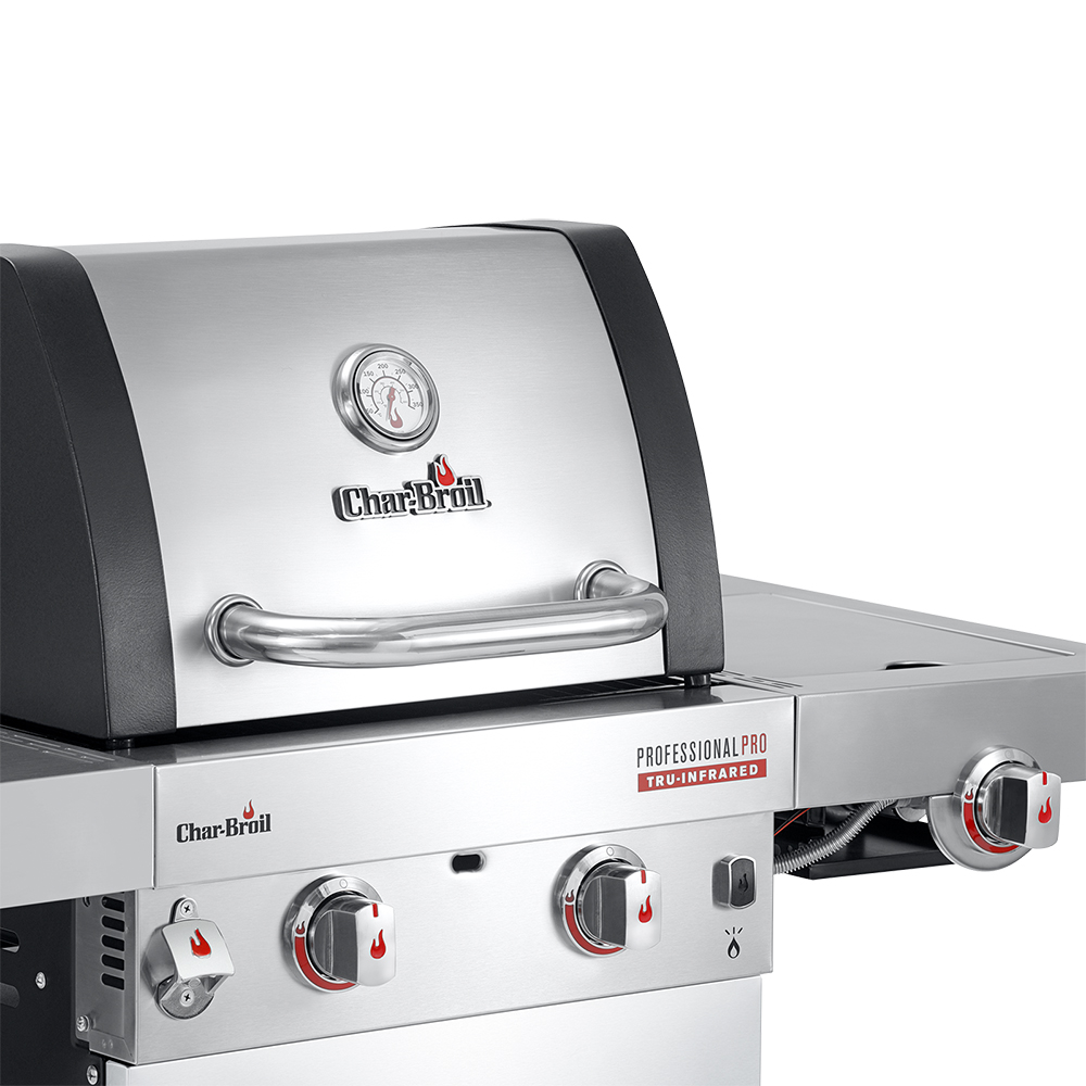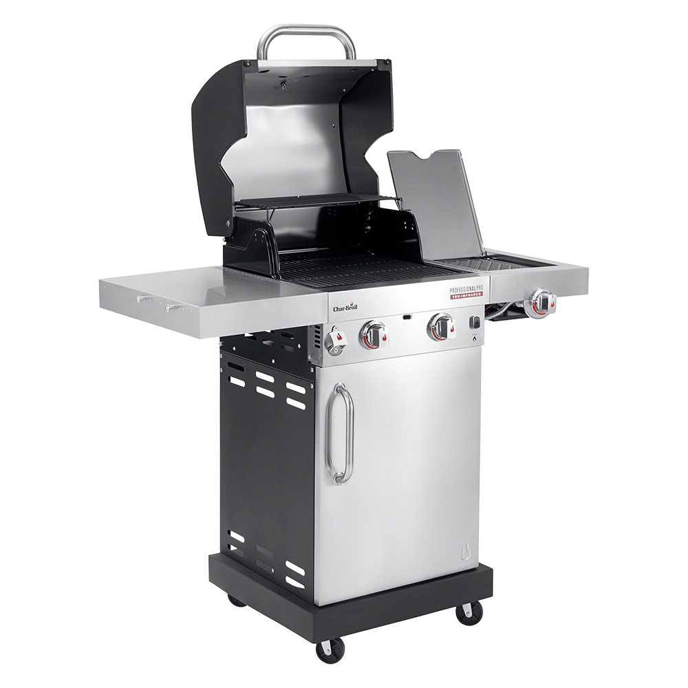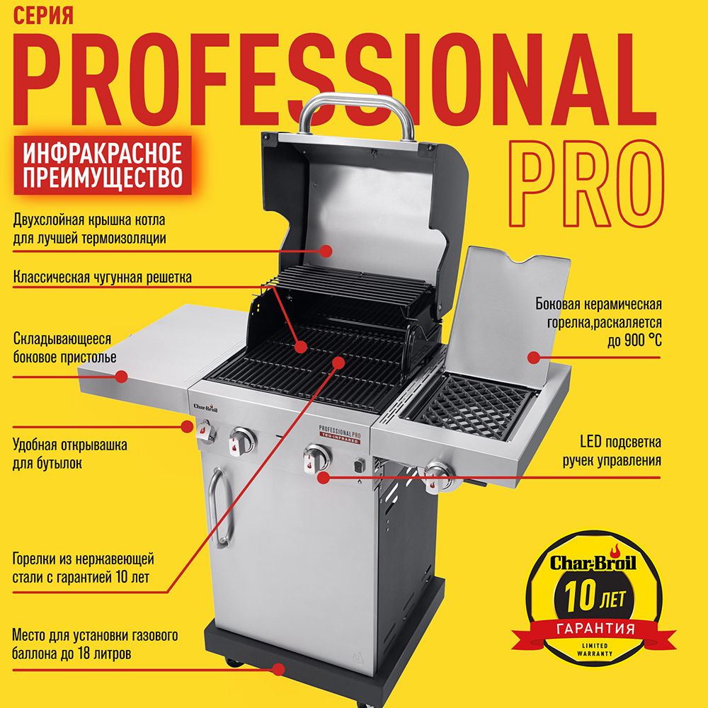 Новейшие газовые грили Char-Broil серии Professional третьего поколения, являются самыми популярными моделями в США, Европе и по всему миру. Газовые грили Professional оснащаются запатентованной инфракрасной пластиной TRU Infrared, которая обеспечивает равномерный жар по всей решётке и предохраняет от вспышек капающего жира в котле. Эта компактная модель с двумя основными и дополнительной боковой горелками прекрасно подойдет для небольшой семьи.