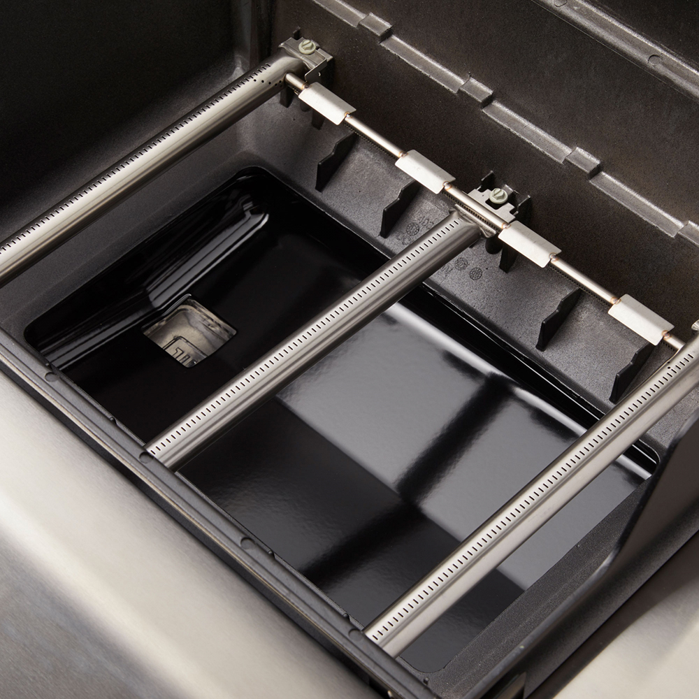 Гриль имеет долговечные и простые в очистке чугунные решётки Gourmet BBQ System, нагревательную подставку, которая сохраняет блюдо тёплым и обеспечивает дополнительную площадь. Корпус, покрытый фарфоровой эмалью, предотвращает появлению ржавчины и трещин.