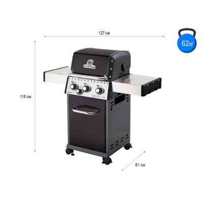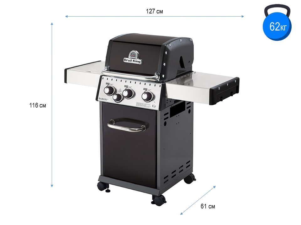 Привлекательный дизайн, складные полки, двухсторонние чугунные решетки. Ручки с плавным ходом и наличие боковой конфорки, это универсальная комплектация, которая удовлетворит большинству кулинарных запросов. Благодаря складным полкам небольшого размера, гриль легко транспортировать и прятать на зиму. Решетка 49×44 см и 3 мощных горелки Dual-Tube позволяют готовить для большой компании и сделают гриль Broil King Baron 340 приятным дополнением Вашего сада.