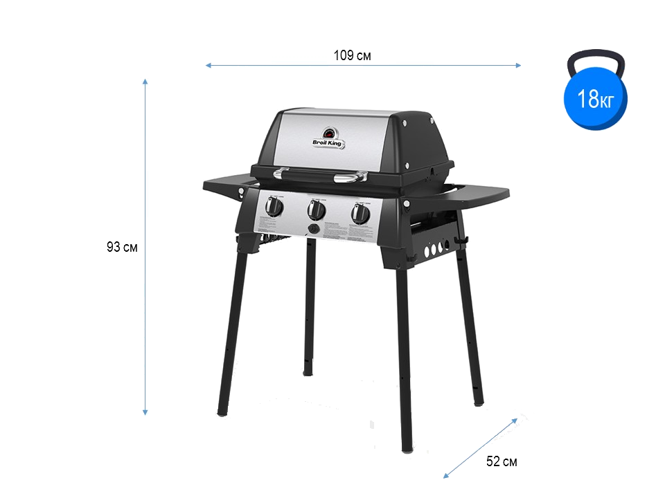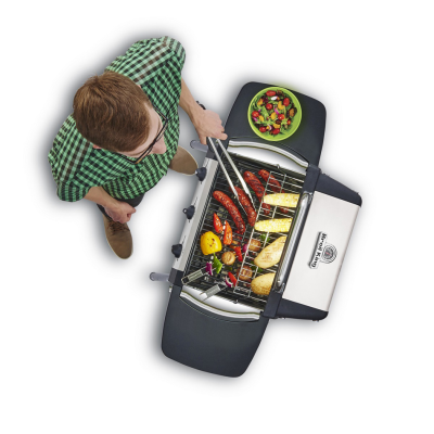 Котел и крышка гриля изготовлены целиком из литого алюминия. Ножки гриля отстегиваются и крепятся к основанию. Три горелки гриля общей мощность 5,25 кВт позволяют использовать все преимущества стационарных газовых грилей, будь то копчение или метод непрямого огня.