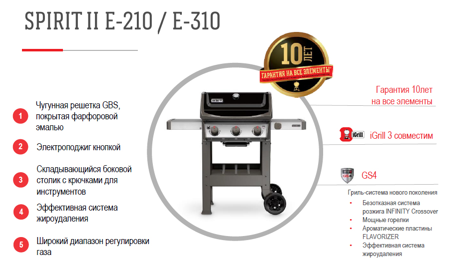 Раскройте все грани барбекю с газовым грилем Weber Spirit E-210, в котором передовые технологии соединились с компактным дизайном. Это отличный вариант для тех, кто ценит качество и удивительную компактность. Weber Spirit E-210 оснащён новейшей гриль-системой GS4 и совместим с термометрами iGrill 3, две горелки из нержавеющей стали позволяют готовить на прямом и непрямом жаре. Откидные боковые столики удобны для сервировки и в сложенном виде позволят установить гриль, даже если Вы располагаете ограниченным пространством.