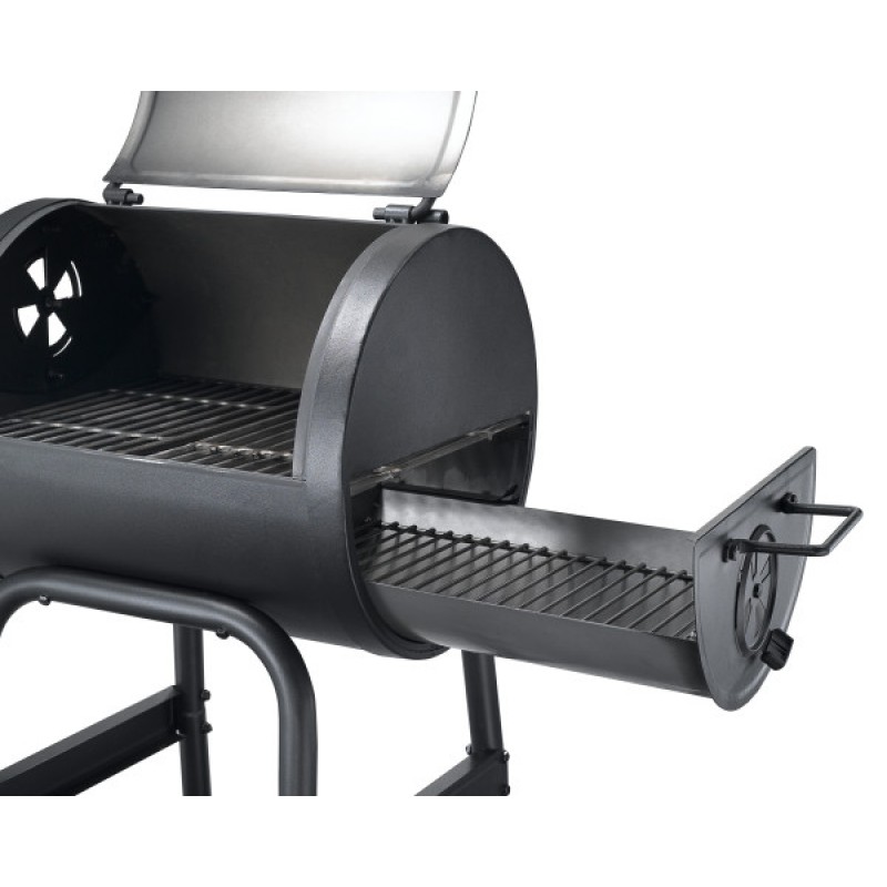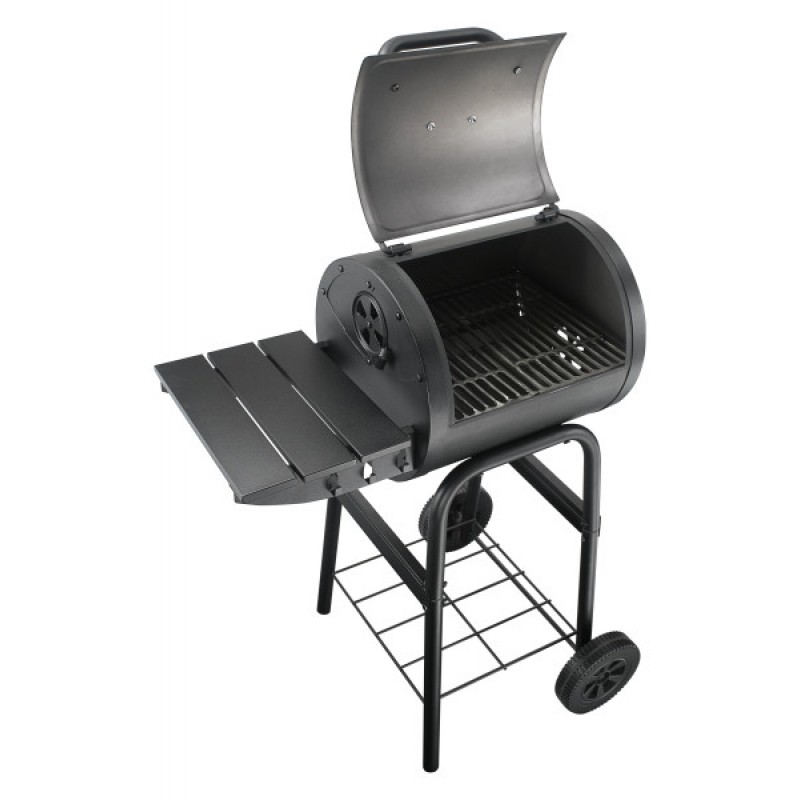 Регулируемый поддон для угля может легко менять высоту, что дает возможность управления степенью жара на решетке. Заслонки поддува есть как в нижней части, так и на крышке гриля. Выдвижной поддон позволяет легко удалить золу и пепел после жарки. Комфортное пристолья дает достаточно места для готовки, а на нижней полке можно хранить уголь. При помощи увеличенных колес гриль легко перемещать по участку.