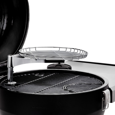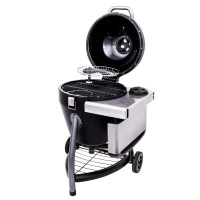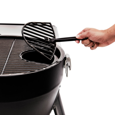 Складывающееся боковое пристолье обеспечивают удобное рабочее пространство при готовке. Чугунная решетка покрытая фарфоровой эмалью, со съемным сегментом для добавления угля. Термометр вмонтирован в крышку. Дополнительная нижняя полка для хранения угля. При помощи больших колес гриль легко перемещать по участку.