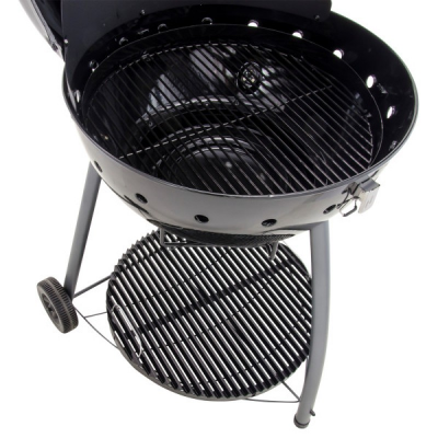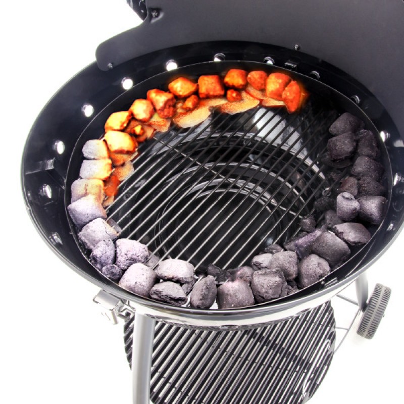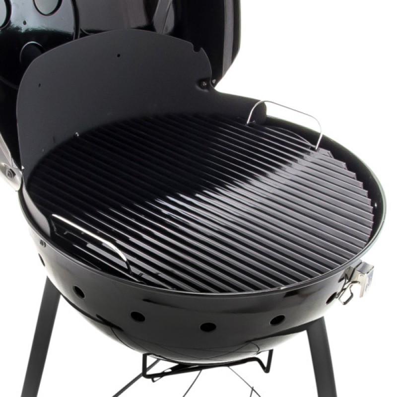 Угольный гриль Char-Broil Kettleman классической круглой формы с уникальными характеристиками. Модель, в которой реализованы самые передовые инженерные идеи. Этот гриль имеет уникальную запатентованную конструкцию решетки, у которой отсутствуют вспышки от капающего жира, сквозь нее не проваливаются мелкие кусочки, равномерно распределяется жар, меньше расход угля. Обновленную крышку не нужно поднимать, теперь она легко сдвигается одной рукой. Отверстия поддува увеличенного размера. Съемный пеплосборник.