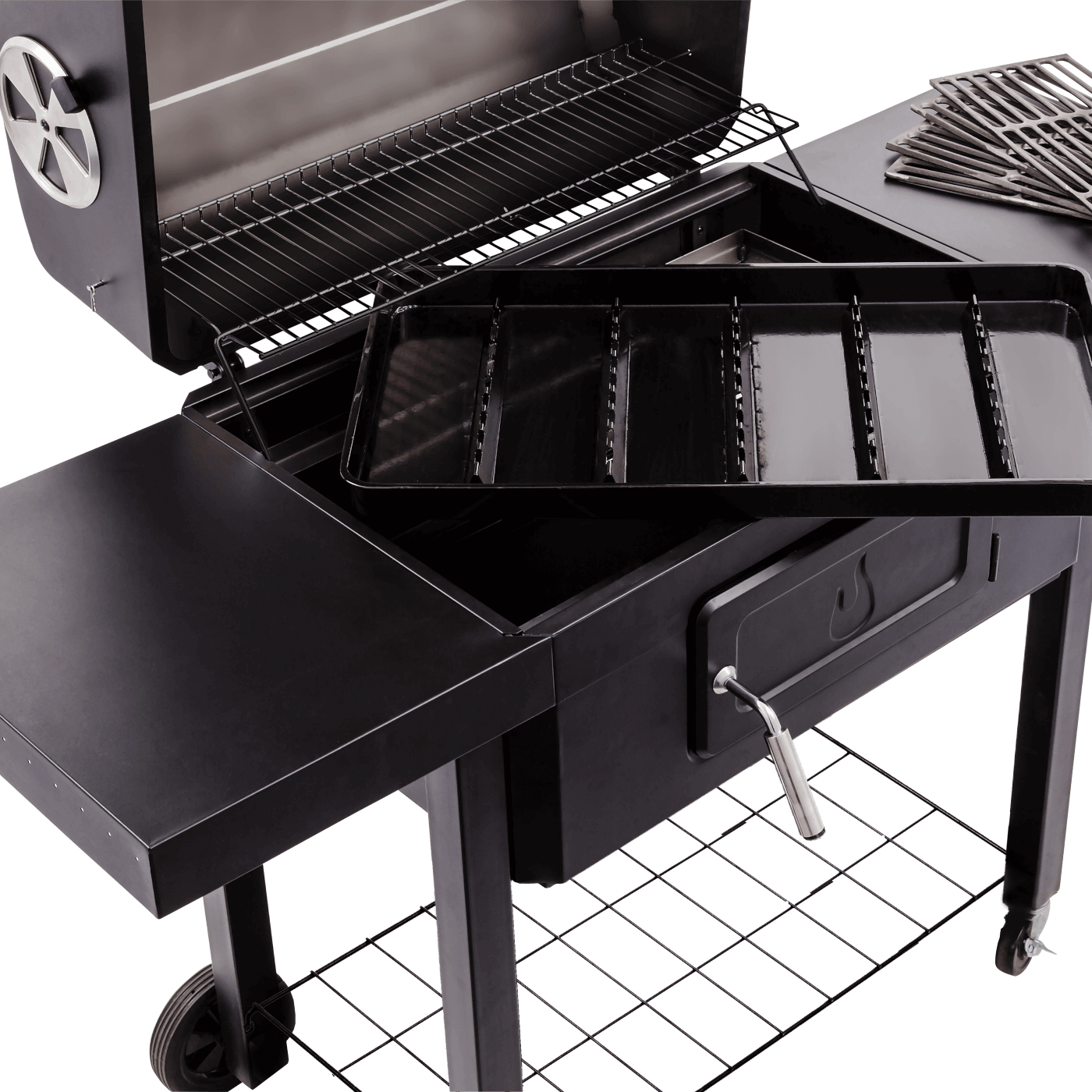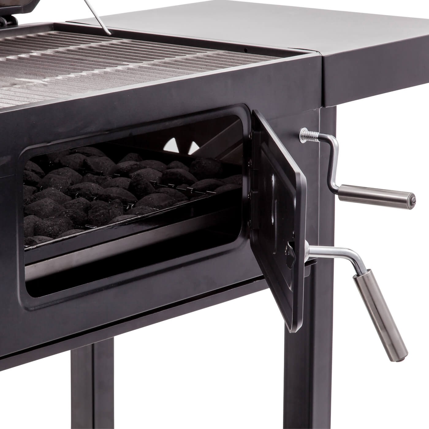 Важное преимущество прилей Performance, это возможность гибкого управления жаром на решетке. Регулируя высоту поддона для угля при помощи ручки, Вы сможете увеличить или уменьшить жар на решетке. А через дверцу для доступа к углю сможете сдвигать его, для создания зоны непрямого жара. Или просто добавить свежего угля. Ну и конечно заслонки поддува есть как в нижней части, так и на крышке гриля. В крышку также вмонтирован термометр.