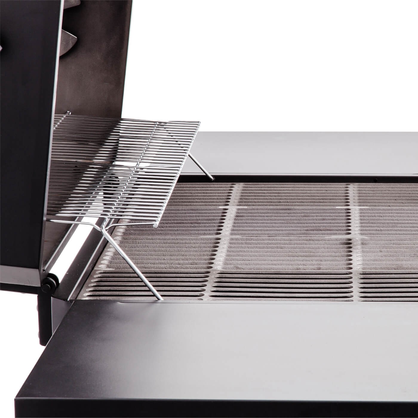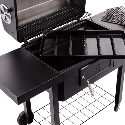 Просторная основная решетка из чугуна, а дополнительная решетка для подогрева покрыта фарфоровой эмалью. Выдвижной поддон позволяет легко удалить золу и пепел после жарки. Широкие пристолья дают достаточно места для комфортной готовки, на нижней полке можно хранить уголь. При помощи увеличенных колес гриль легко перемещать по участку.