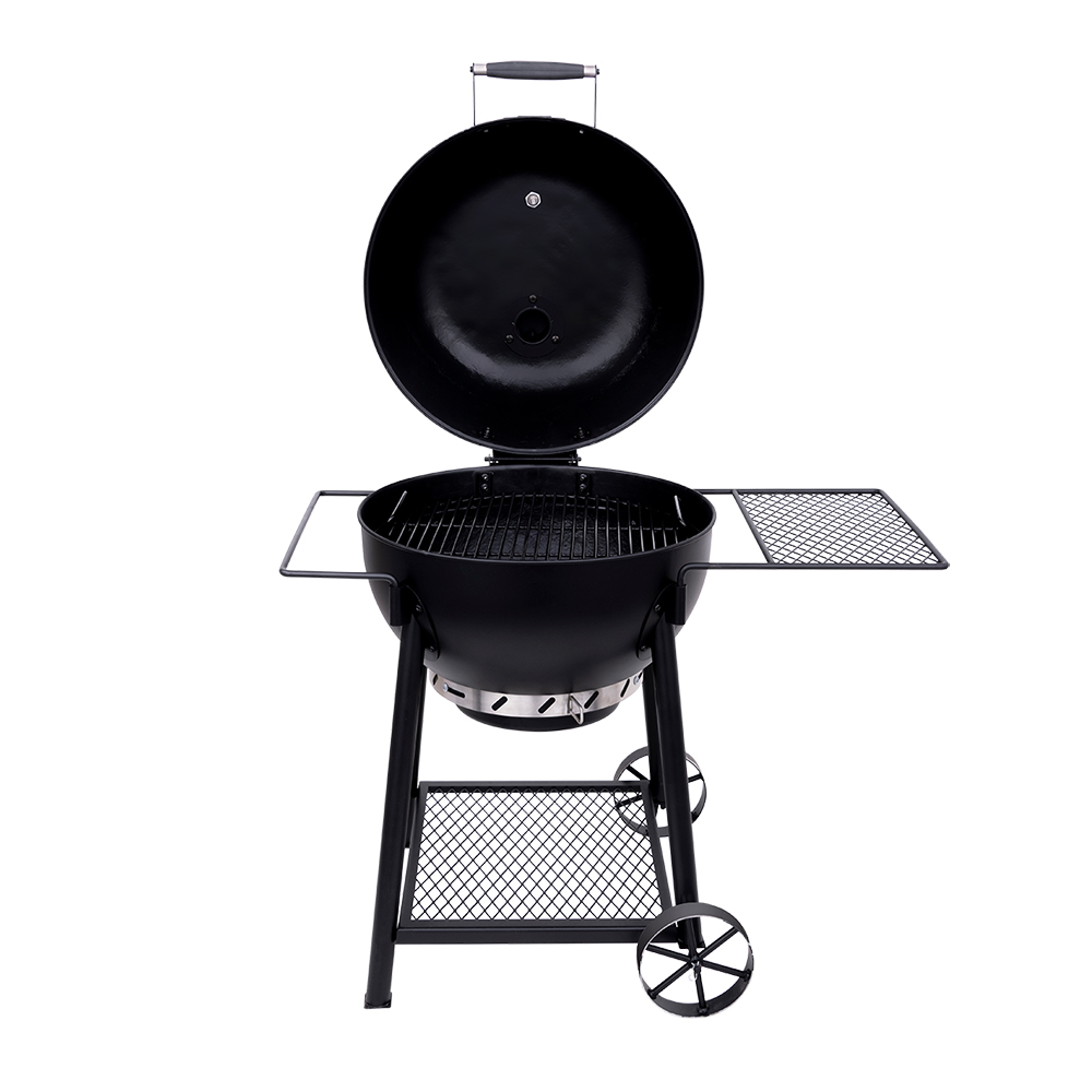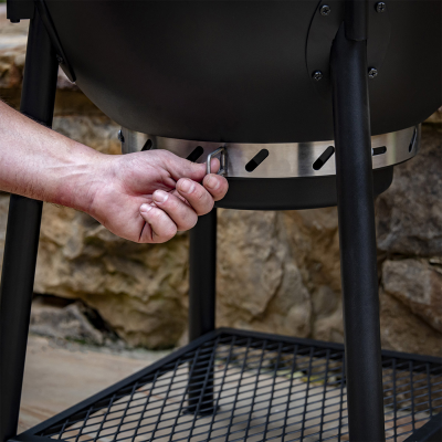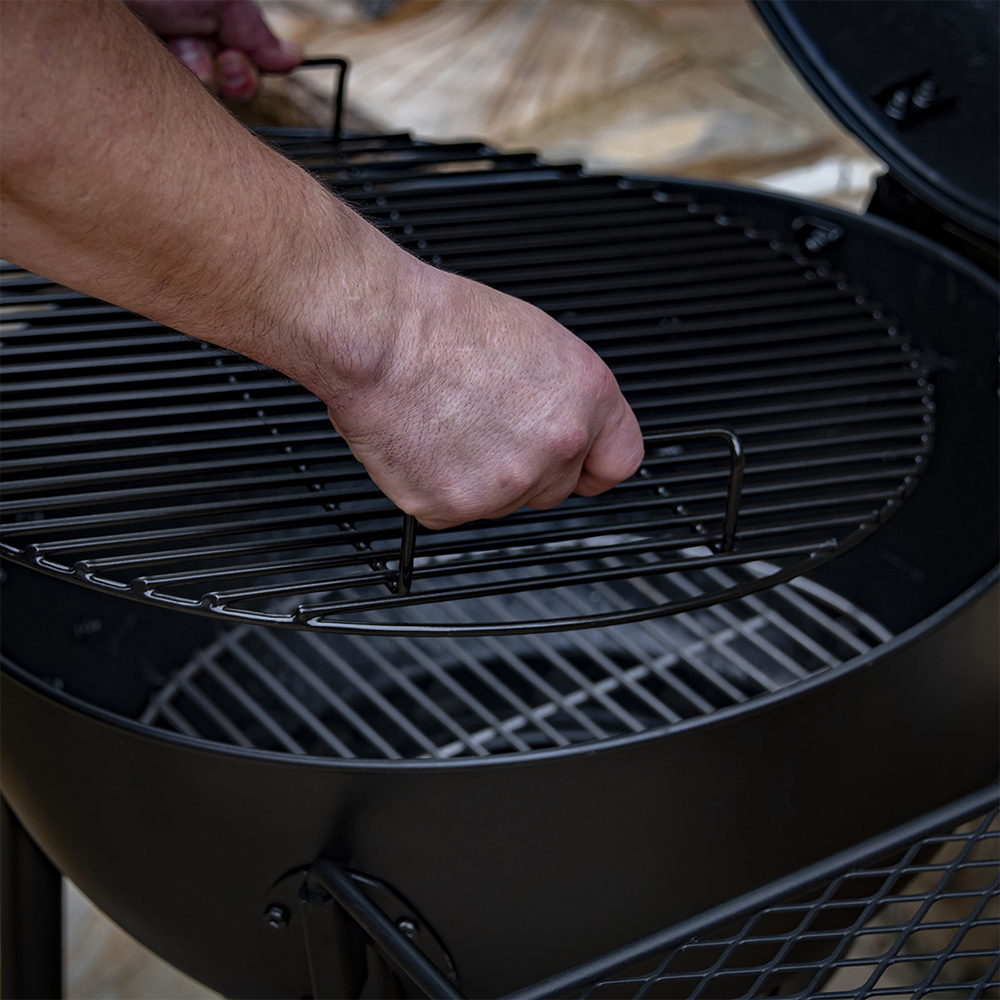 Oklahoma Joe's Blackjack — это классический угольный гриль дополненный инновационными деталями. Котёл и крышка гриля имеют матовое фарфоровое покрытие для защиты от коррозии. Крышка на петлях гарантирует удобство готовки, а съёмный, с фарфоровым покрытием сборник пепла очень просто чистить. Круговая система забора воздуха 360° и регулируемая вытяжная труба обеспечат равномерное горение угля и контроль температуры. Профессиональный, легкочитаемый 3-х дюймовый термометр. Боковое пристолье и держатель для полотенец можно легко менять местами.