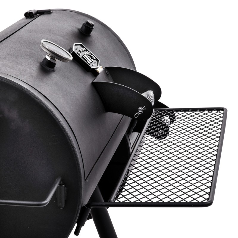 Высокопрочная конструкция жаровни выдерживает экстремальные температуры, даже при копчении дровами. Жаровня снабжена съемным стальным ящиком, для удобной очистки от пепла и грильной решеткой. Имеет удобную заслонку поддува и ненагревающиеся ручки. Просторная камера копчения с крупным, легкочитаемым термометром на крышке. При желании можно самостоятельно вкрутить второй термометр (не входит в комплектацию) для идеально точного контроля температуры в камере. Для удобства работы имеется фронтальная полка и широкая нижняя полка.