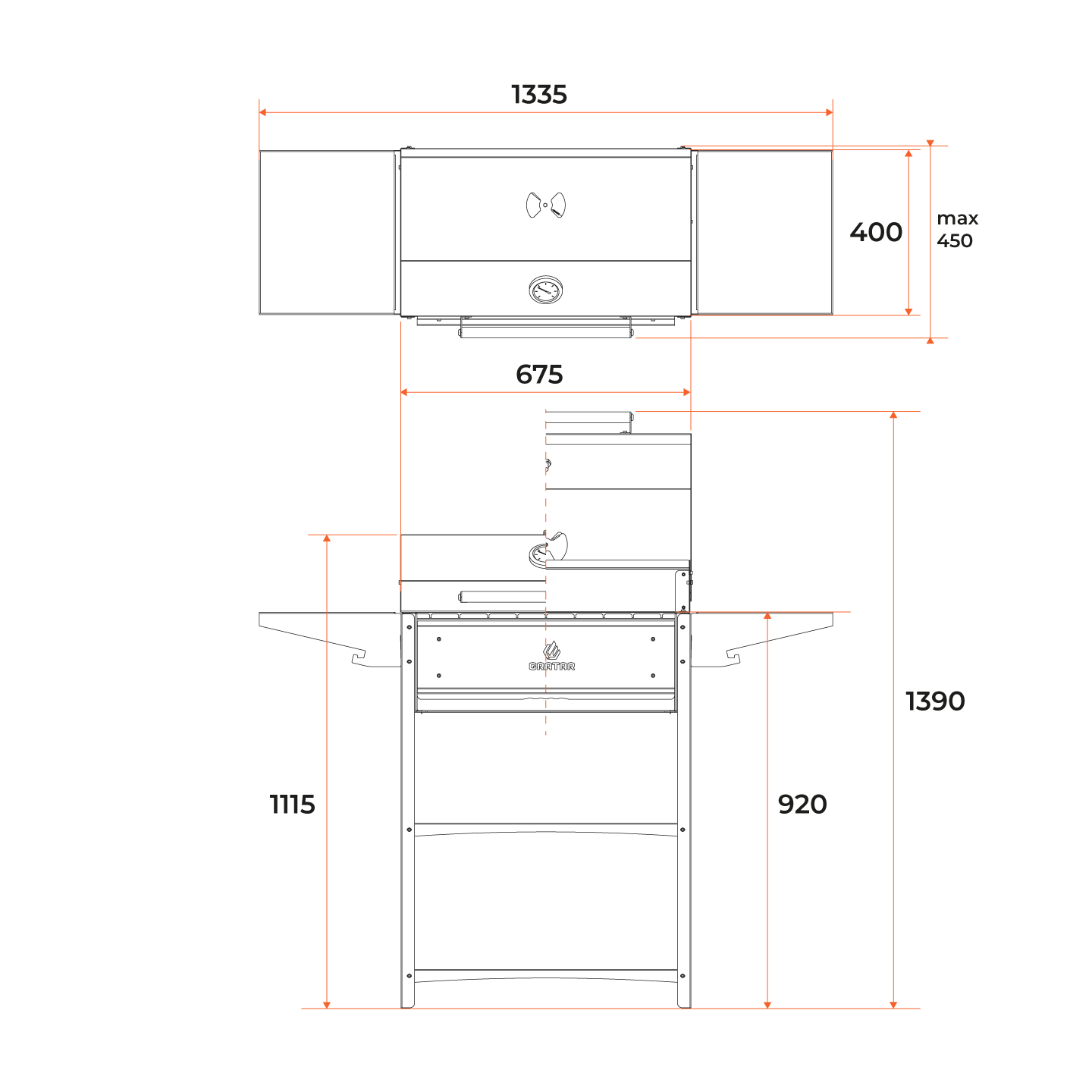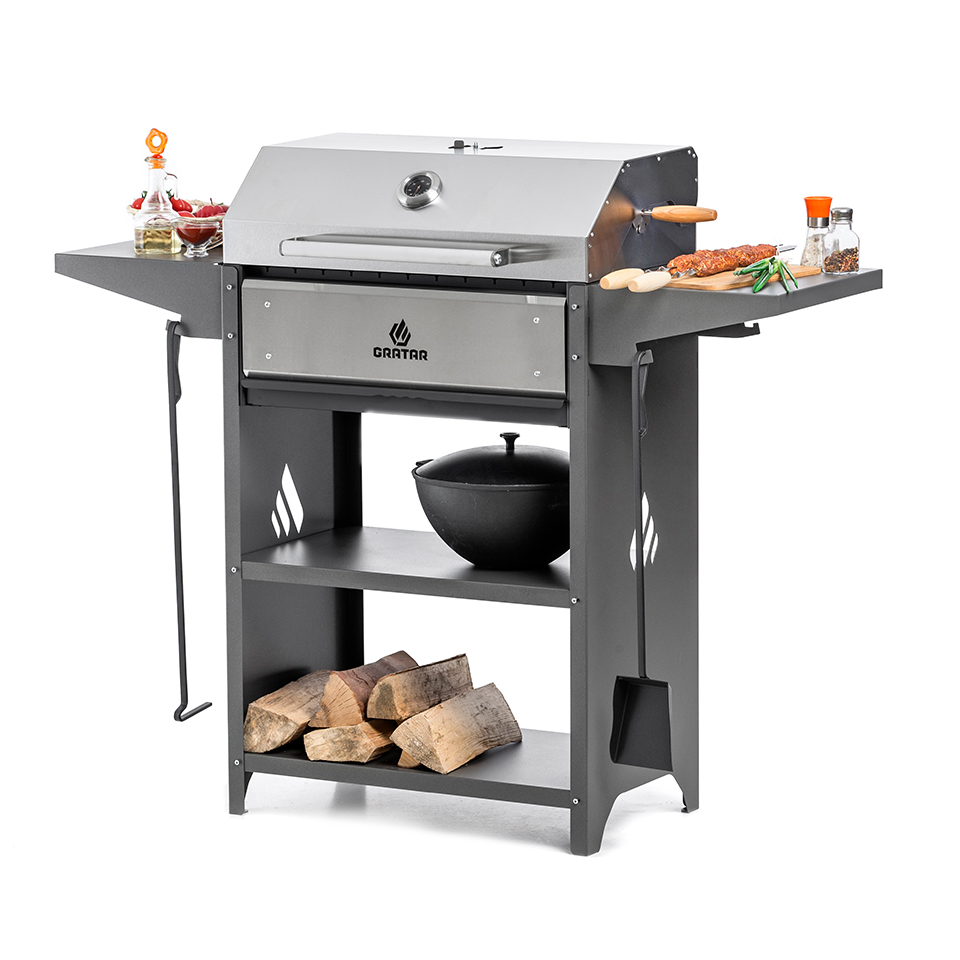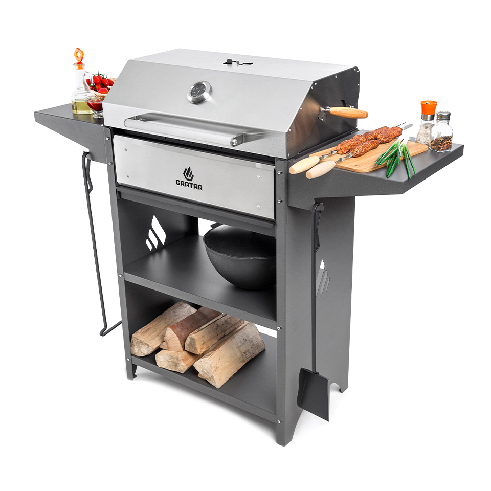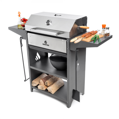 Отличный гриль-мангал для семейных посиделок. Топка с декоративной накладкой из нержавеющей стали и выдвижным зольником для регулировки интенсивности жара.