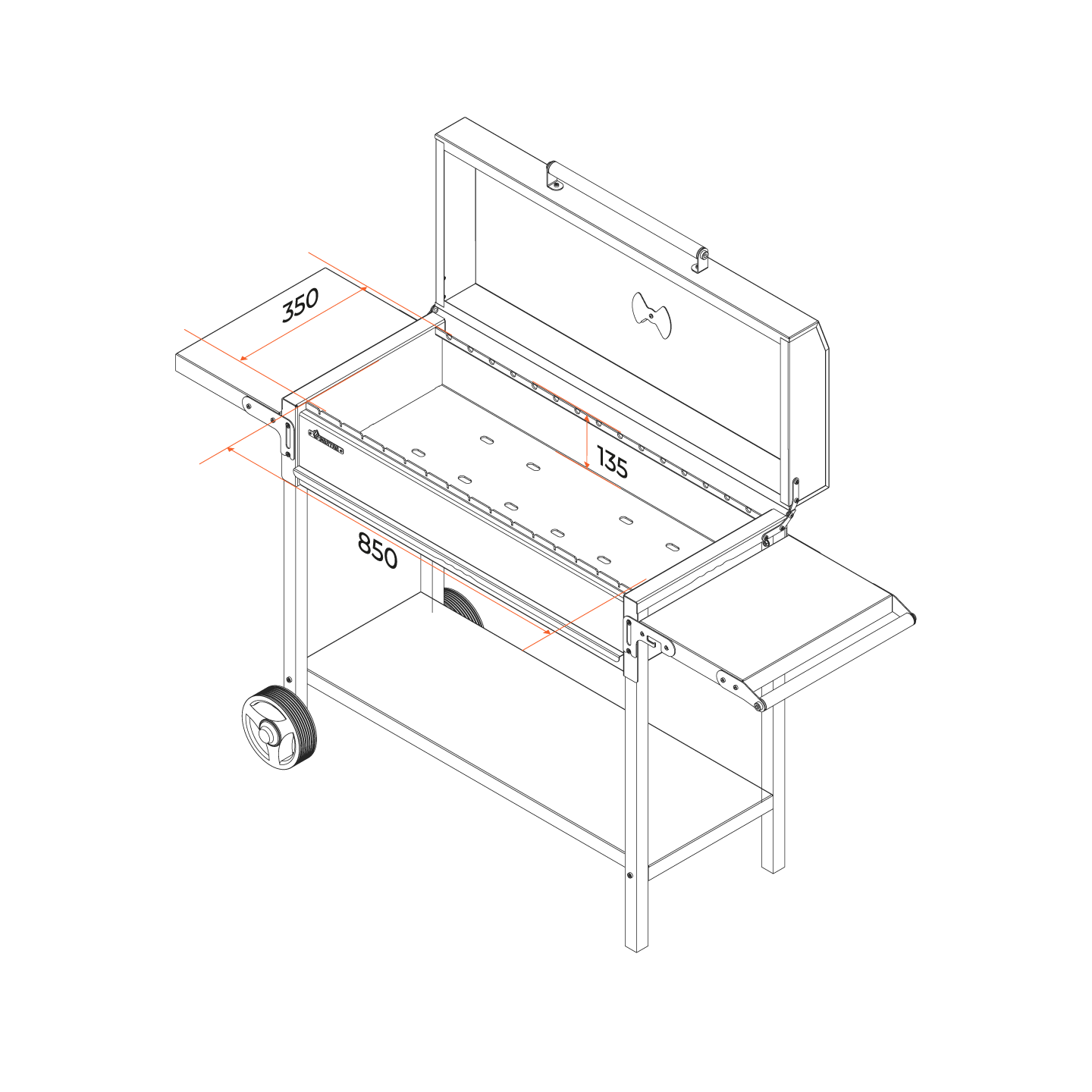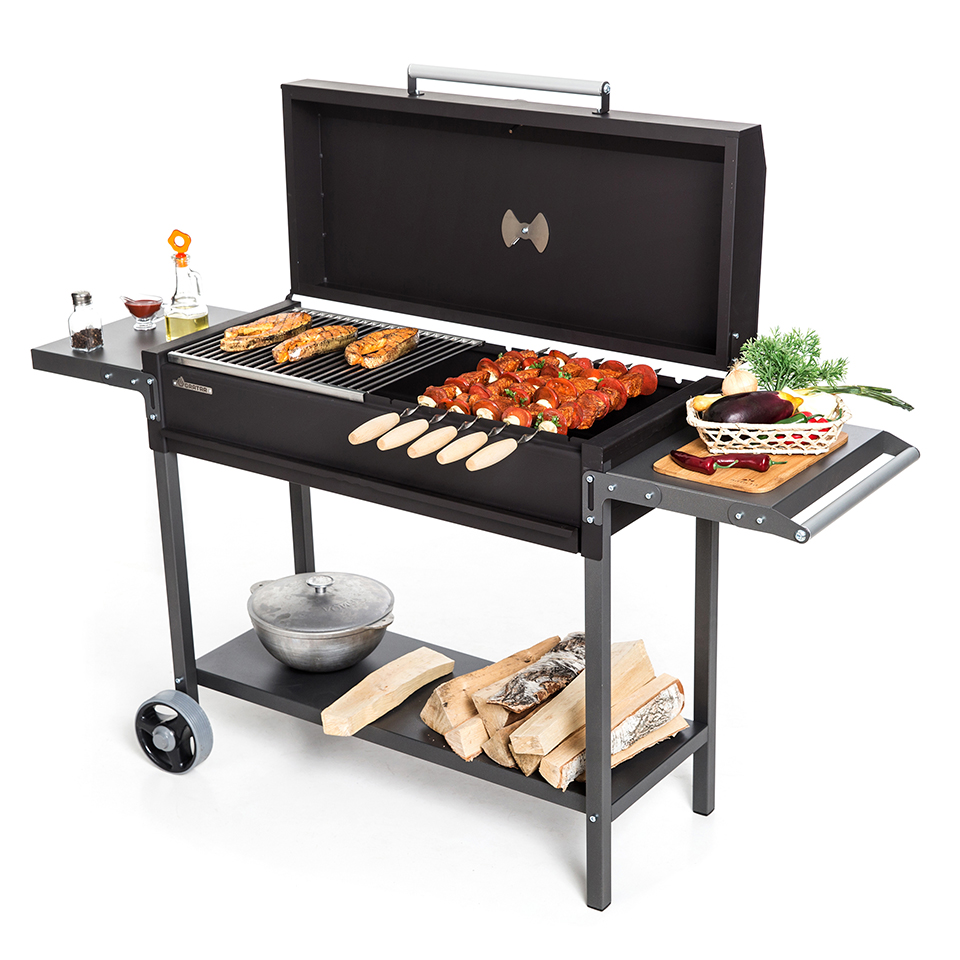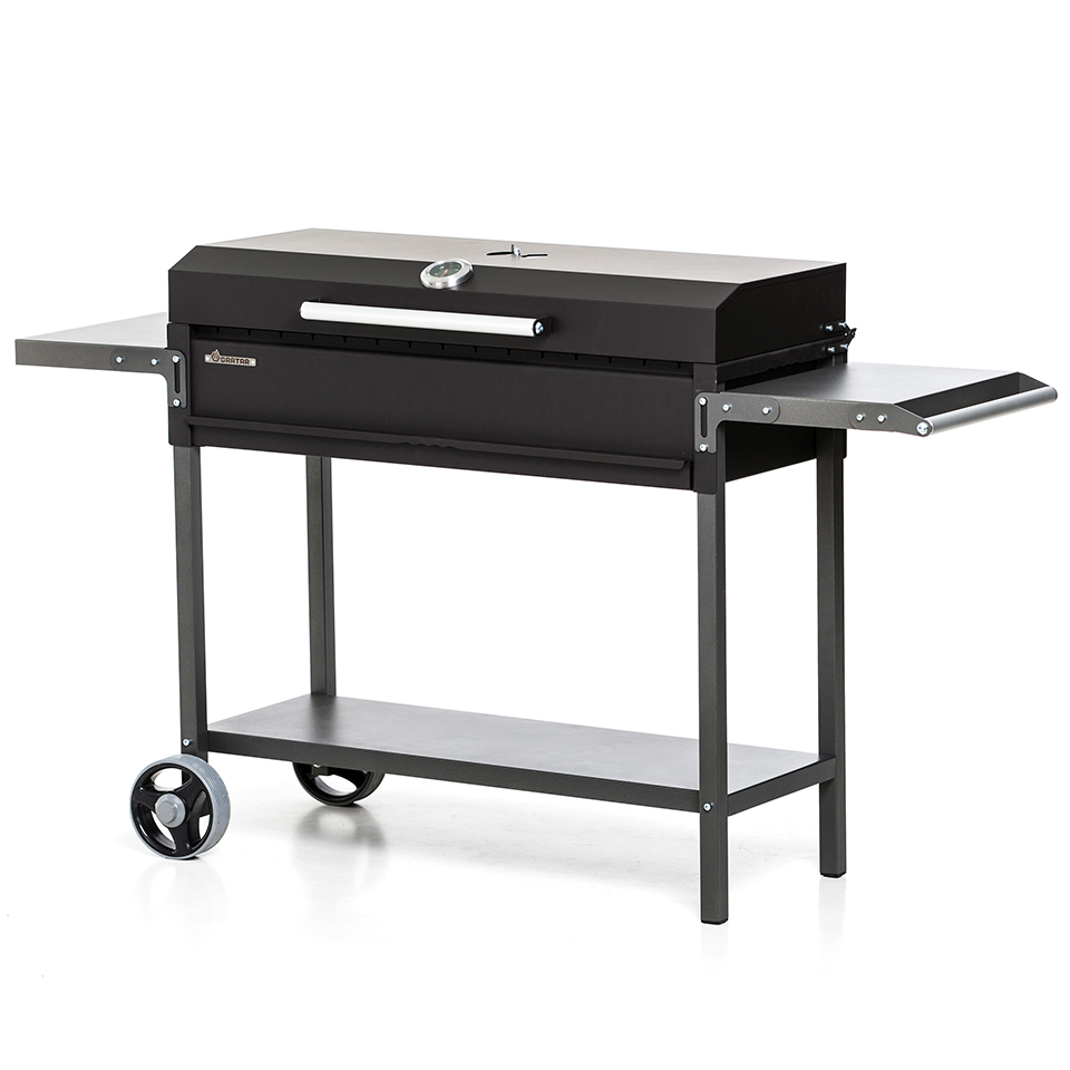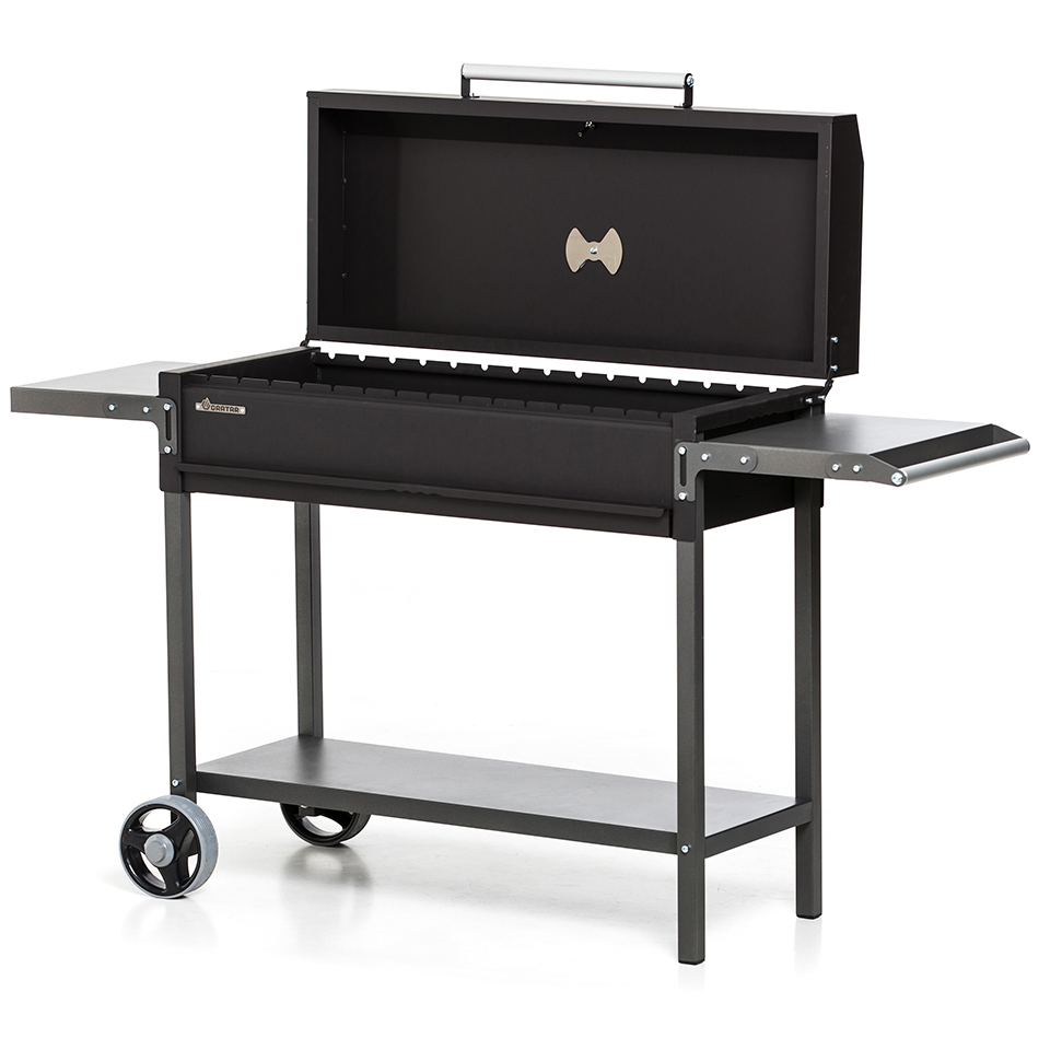 Функциональный гриль-мангал из толстой стали со складными полками и крышкой барбекю. Крышка оборудована термометром и заслонкой для регулировки притока воздуха, а в основании топки устроен выдвижной зольник.