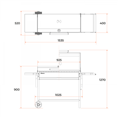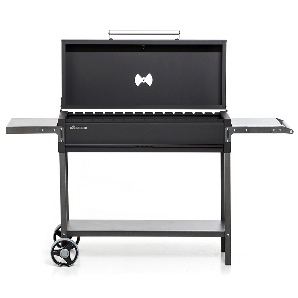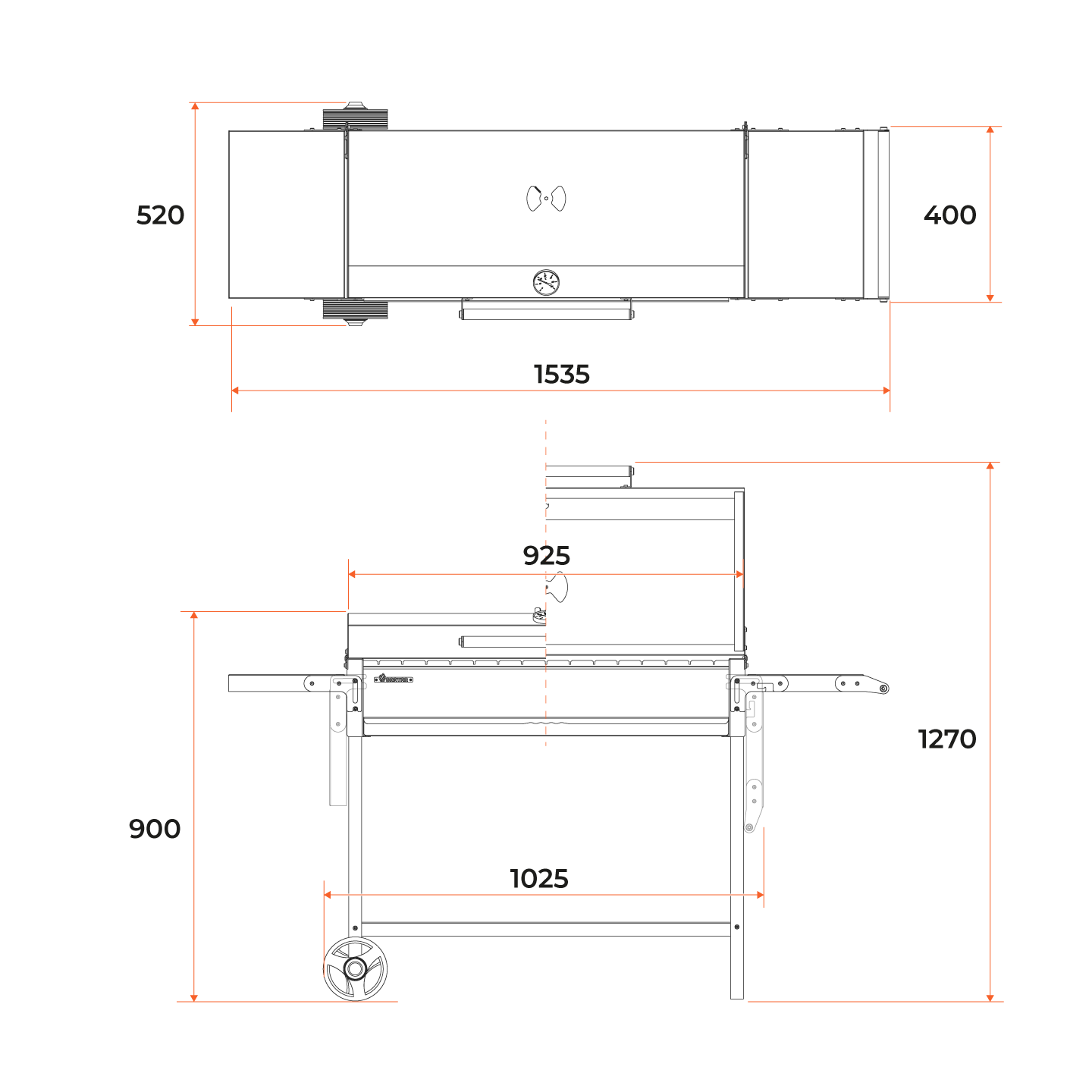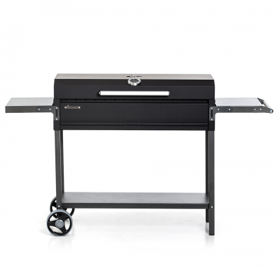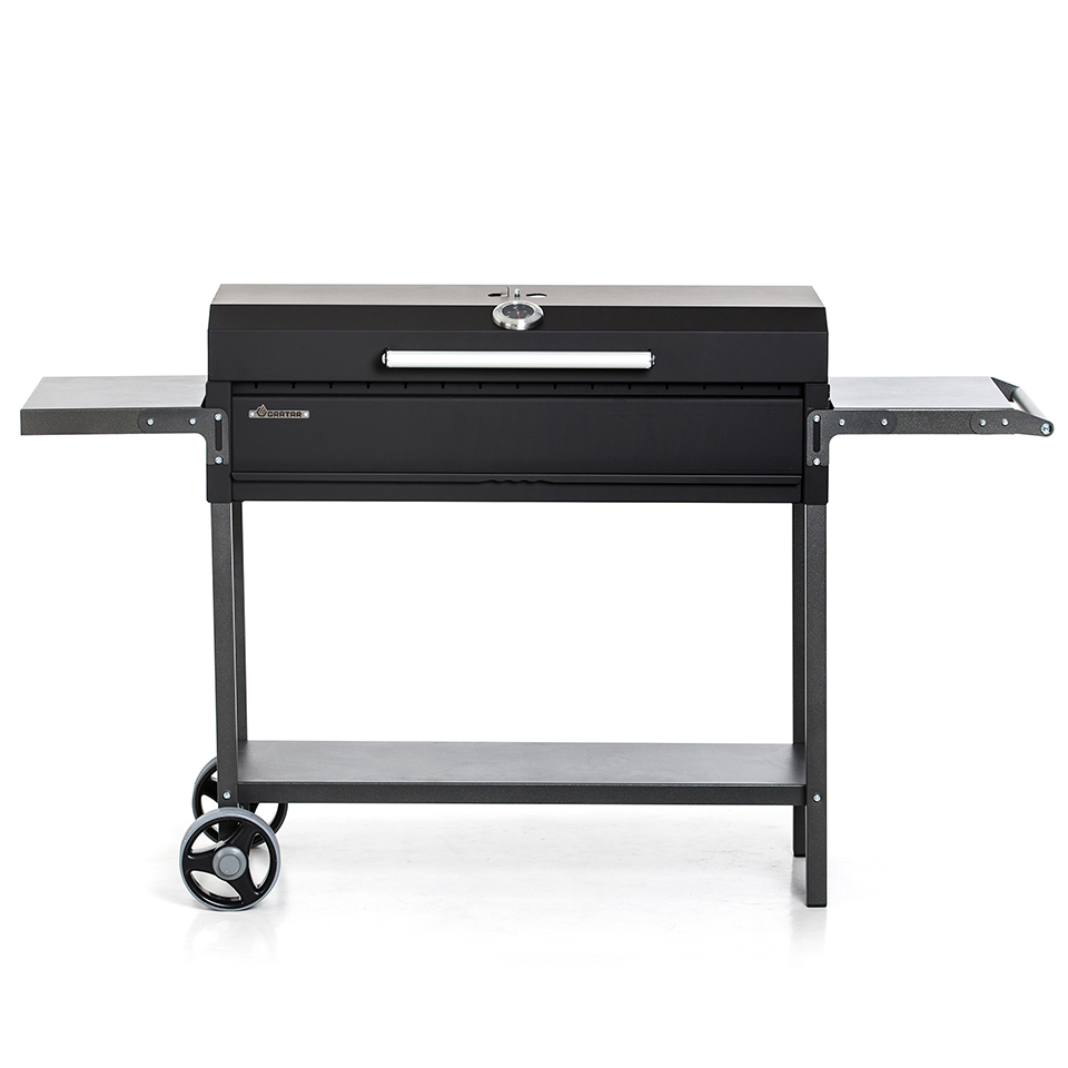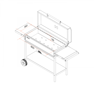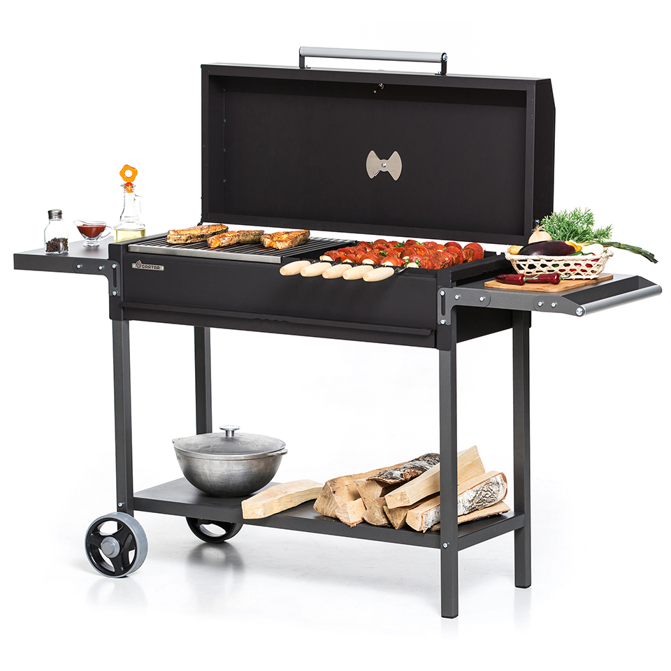Функциональный гриль-мангал из толстой стали со складными полками и крышкой барбекю. Крышка оборудована термометром и заслонкой для регулировки притока воздуха, а в основании топки устроен выдвижной зольник.