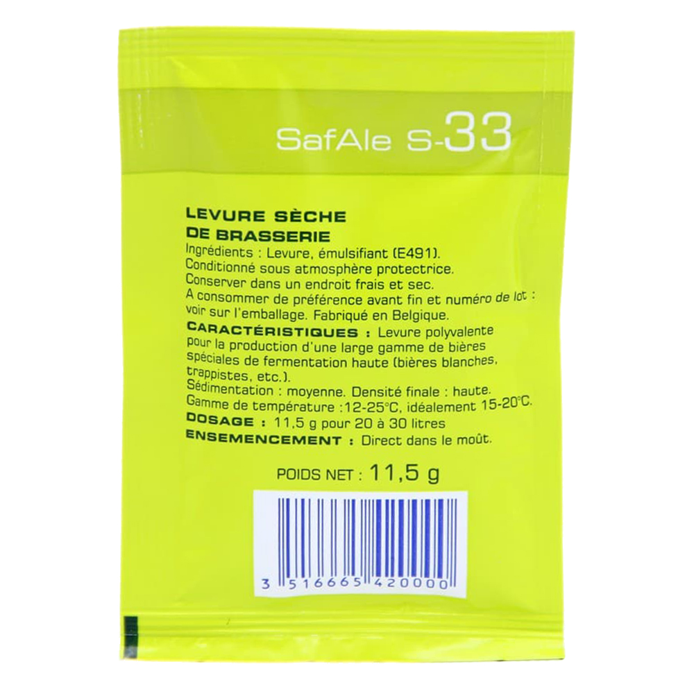 Дрожжи пивные «Safale S-33» — общепризнанный многофункциональный штамм, отличающийся устойчивостью в хранении и стабильностью результата. Этот штамм позволяет получить изумительные ароматические профили, а также идеален для производства специальных сортов пива. Отличные результаты получены при производстве крепкого пива с содержанием до 7,5%, а также этот штамм может сбраживать сусло до 11,5%. Идеально подходят для всех сортов элей.