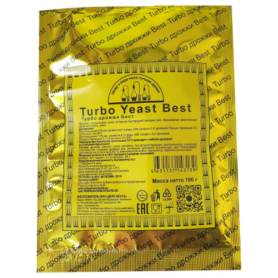 Дрожжи спиртовые «Best Turbo» — дрожжи для быстрого сбраживания чистого сахара и получения алкогольных напитков. Дрожжи «Best Turbo» — это смесь сложных питательных веществ и алковыносливых дрожжей. Добавление данного продукта ускоряет весь процесс брожения. Дрожжи преимущественно используются в сбраживании сахарных и зерновых браг.