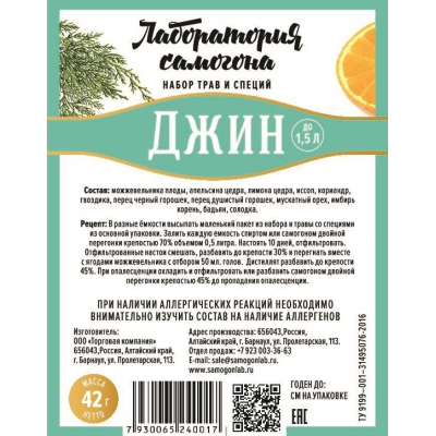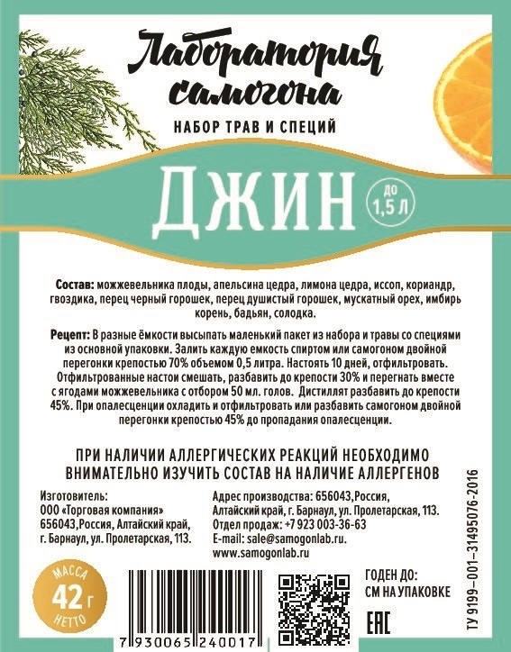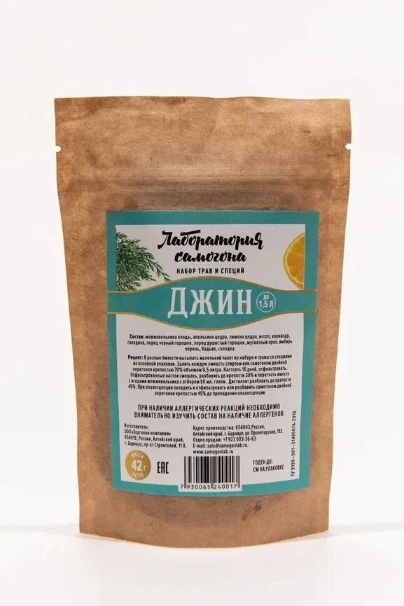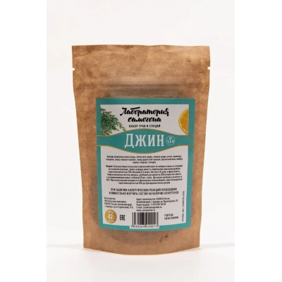 Рецепт: В разные емкости высыпать маленький пакет с можжевельником и содержимое большой упаковки. Залить каждую емкость спиртом или самогоном двойной перегонки крепостью 65-70% объемом 0,5 л. Настоять 10 дней, отфильтровать. Отфильтрованные настои смешать, разбавить до крепости 30% и перегнать с ягодами можжевельника и отбором 50 мл «голов». Дистиллят разбавить до крепости 45%. При опалесценции охладить и отфильтровать или разбавить самогоном двойной перегонки крепостью 45% до пропадания опалесценции.
