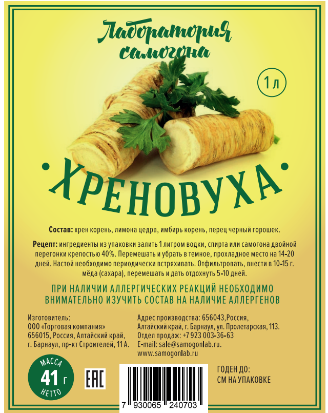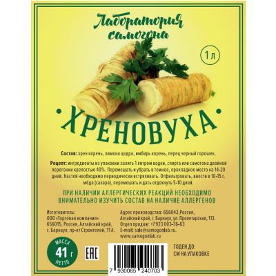 Хреновуха, хреновая водка, хреновая настойка, хреновка — давно известный крепкий спиртной напиток, еще со времен Петра I. Достаточно распространенным является и в наши дни. С данным набором специй Вы сможете приготовить свою уникальную хреновуху. Основные составляющие набора подобраны в таких пропорциях, чтобы готовый напиток обладал сбалансированным вкусом и ароматом.