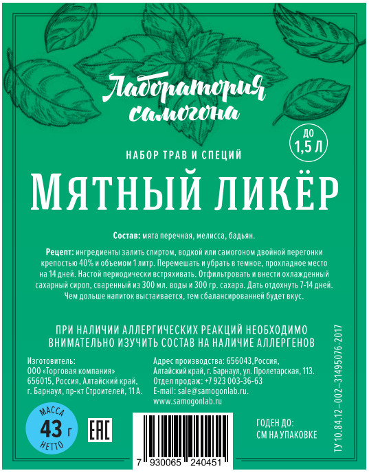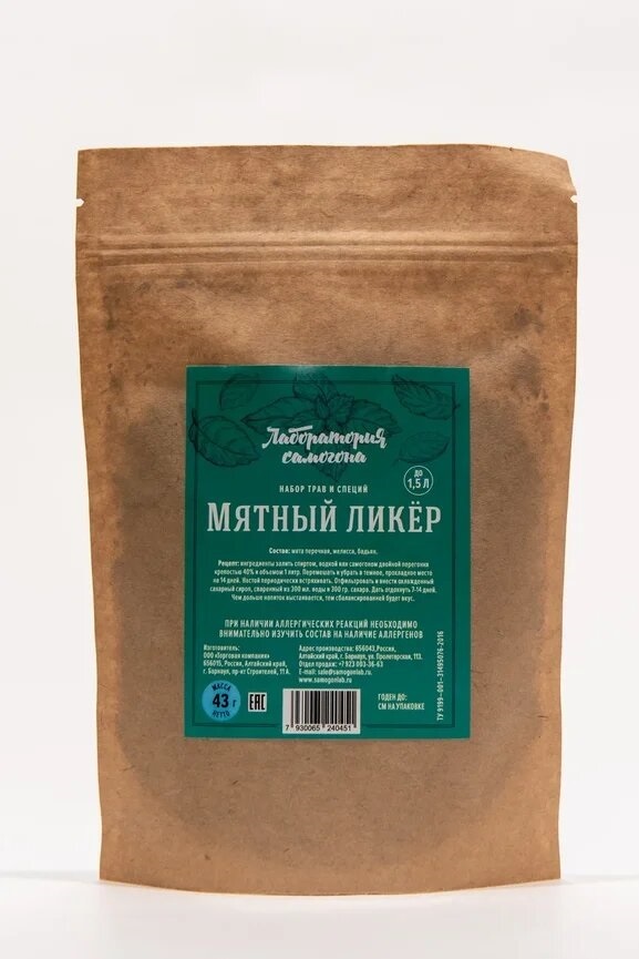 «Мятный ликёр» — напиток, который изготавливается на основе мяты. Обладает освежающим, приятным ароматом и сладковато-горьким вкусом. Хорошо бодрит и освежает. Оказывает благоприятное действие на иммунную систему. Из данного набора Вы сможете приготовить 1,5 л освежающего и согревающего мятного ликёра.