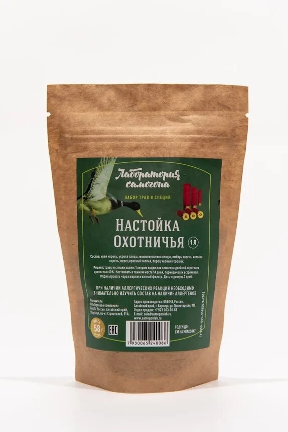 Набор трав и специй «Настойка Охотничья» представляет собой сухие смеси трав и специй для облагораживания и придания новых вкусовых букетов домашним алкогольным напиткам. Все ингредиенты подобраны и собраны индивидуально в особых экологически чистых зонах Кавказа. За счёт полной натуральности всех применяемых компонентов — набор благотворно влияет на вкус напитков, а также полезен для здоровья!