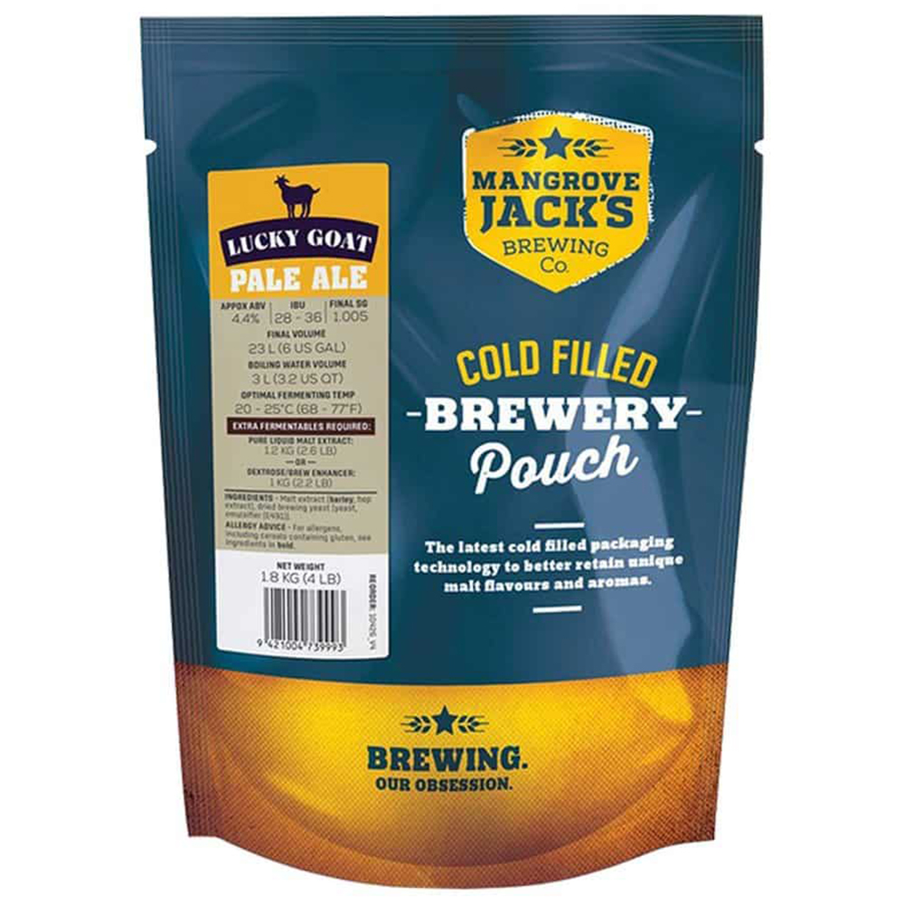 Солодовый экстракт Mangrove Jack's Lucky Goat Pale Ale весом 1,8 кг на 23 л домашнего пива — профессиональный английский набор для создания вкусного домашнего пива со следующими вкусовыми характеристиками: насыщенный солодовый вкус с лёгким оттенком печенья во вкусе и приятной горечью. Получаемое пиво имеет насыщенный золотистый оттенок. В состав комплекта солодового экстракта входит: упаковка солодового экстракта и пакетик дрожжей; комплект рассчитан на приготовление 23 л пива в домашних условиях.
