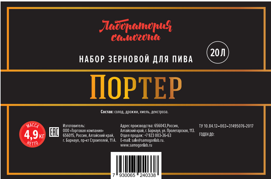 Зерновой набор "Лаборатория самогона" для приготовления пива "Портер"