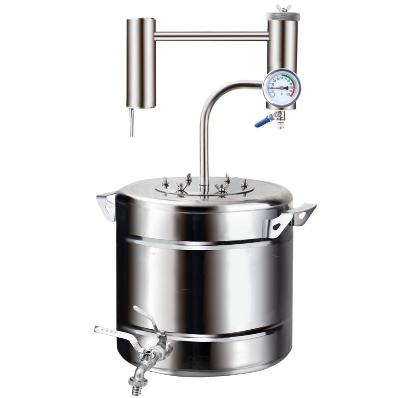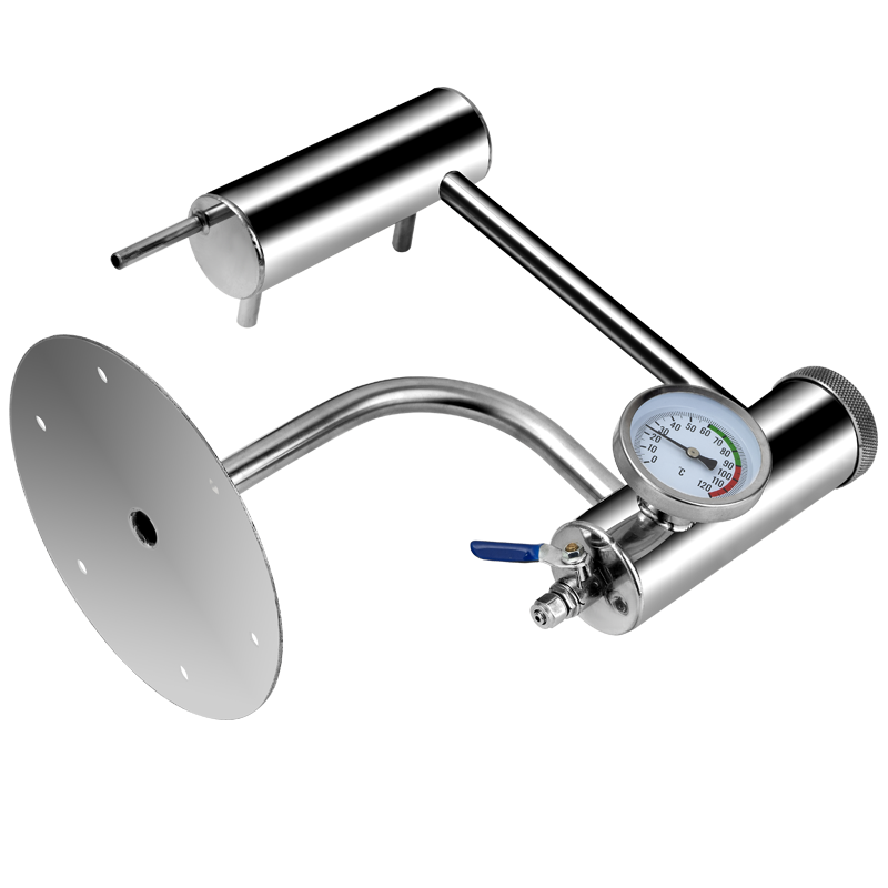 Сухопарник — ёмкость между баком и холодильником, предотвращает попадание вредных примесей в конечный продукт. Широкая горловина бака (11,7 см) даёт возможность с лёгкостью заливать брагу, а также мыть бак после использования. Классический змеевик в проточном холодильнике делает процесс конденсации пара эффективным, и на выходе Вы получаете уже охлаждённый продукт.