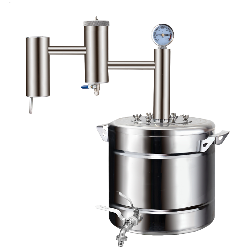 Сухопарник — ёмкость между баком и холодильником, предотвращает попадание вредных примесей в конечный продукт. Широкая горловина бака (11,7 см) даёт возможность с лёгкостью заливать брагу, а также мыть бак после использования. Классический змеевик в проточном холодильнике делает процесс конденсации пара эффективным, и на выходе Вы получаете уже охлаждённый продукт.