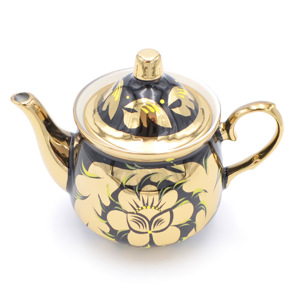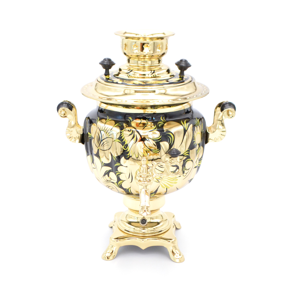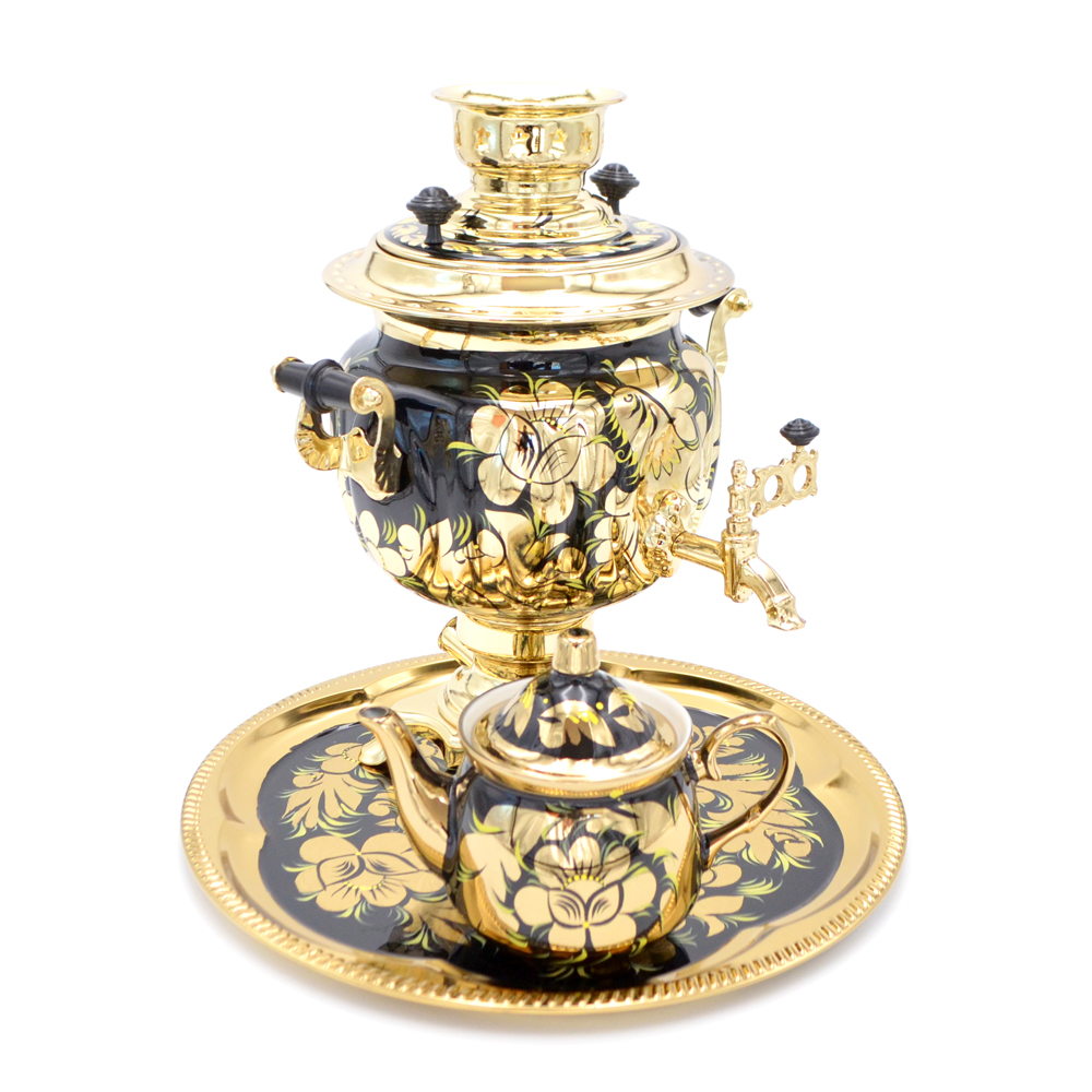 В наборе самовар электрический и классической формой корпуса, а также круглый, как солнце, поднос и изящный чайник для заварки. Шикарный набор, который может стать идеальным подарком на какое-либо торжественное событие. Эксклюзивная ручная роспись придает строгим формам набора светского шарма. А безупречное качество покрытия позволит Вам любоваться рисунками много лет.