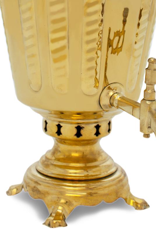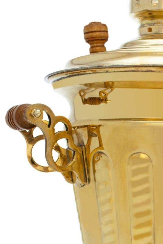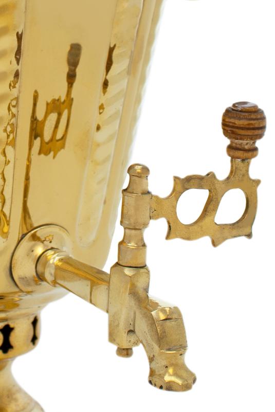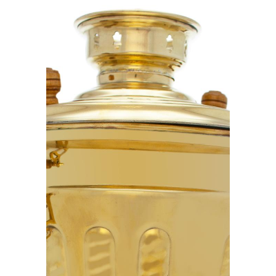 Самовар объемом 5 л выполнен в традиционной форме рюмки. Жаровый самовар «Суксунская рюмка» изготовлен из высококачественной латуни. Внутри нанесено белоснежное лужение пищевым оловом. Такое покрытие долговечно и безопасно для бытового использования. Ручки обладают не только прекрасными теплоизоляционными свойствами, но и несут на себе эстетический акцент, наполняя весь самовар русским колоритом.