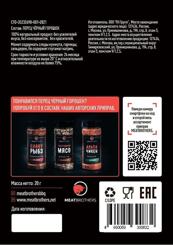 Чёрный перец горошком Meatbrothers, саше 20 г
