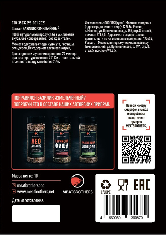 100% натуральный продукт: без усилителей вкуса, без консервантов, без красителей. Базилик может содержать следы кунжута, горчицы, сельдерея.
