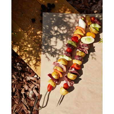 Легко прикрепляется к тандыру. Как правило, на стандартных шампурах возникают трудности с нежными продуктами, такими как грибы, овощи. Мелкие шампиньоны разрываются, соскальзывают. Эти двойные шампуры тонкие как игла (по сравнению со стандартными шампурами) и делают соскальзывание продуктов невозможным. Отлично для запекания креветок, картошки с салом, любых грибов, овощей и других мелких ингредиентов.