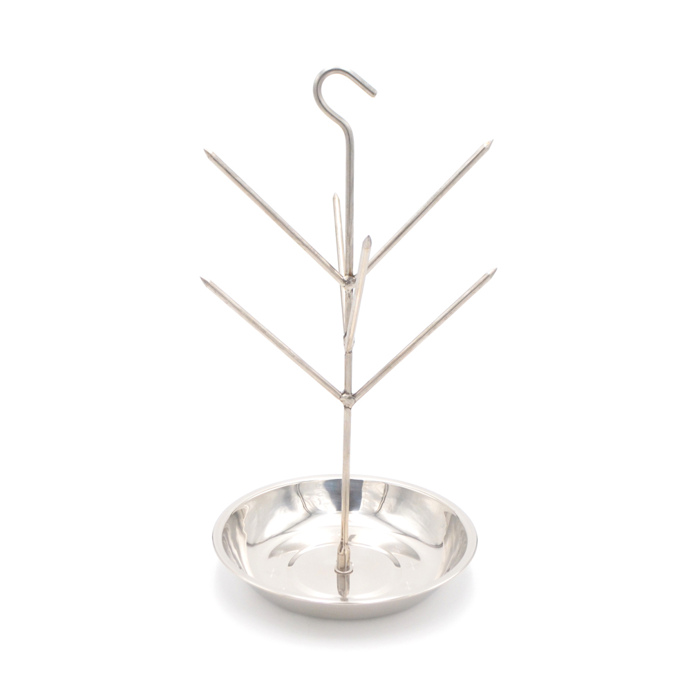 Ёлочка 21 см с низким бортом имеет крюк для крепления к тандыру, 6 заострённых шипов и миску с низкими бортами для сбора жира/сока, а также конструкция позволяет готовить овощи и грибы, не опасаясь, что они могут соскользнуть и упасть на угли. Просто нарежьте картошку, выложите на миску и через 20 минут получите порцию вкусного шашлыка с запечённой картошкой. Выполнена полностью из нержавеющей стали, ёлочка расширит возможности использования тандыра и будет служить долгие годы, радуя Вас и Ваших гостей!