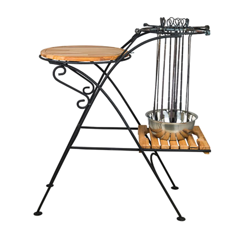 Стойка-солнышко — это прекрасный помощник для приготовления блюд в тандыре. Конструкция является функциональным многоярусным изделием с подставкой для крышки от тандыра, столешницей, разделочной доской и круглой перекладиной для подвешивания необходимых аксессуаров для готовки.