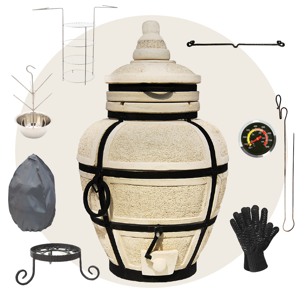 тандыр, шампуры, кочерга, совок, колосник, приспособление для подвешивания шампуров, подставка под тандыр, чехол на тандыр, этажерка 4-х ярусная средняя, ёлочка 21 см с высоким бортом, шампур двойной, перекладина, термометр, перчатки