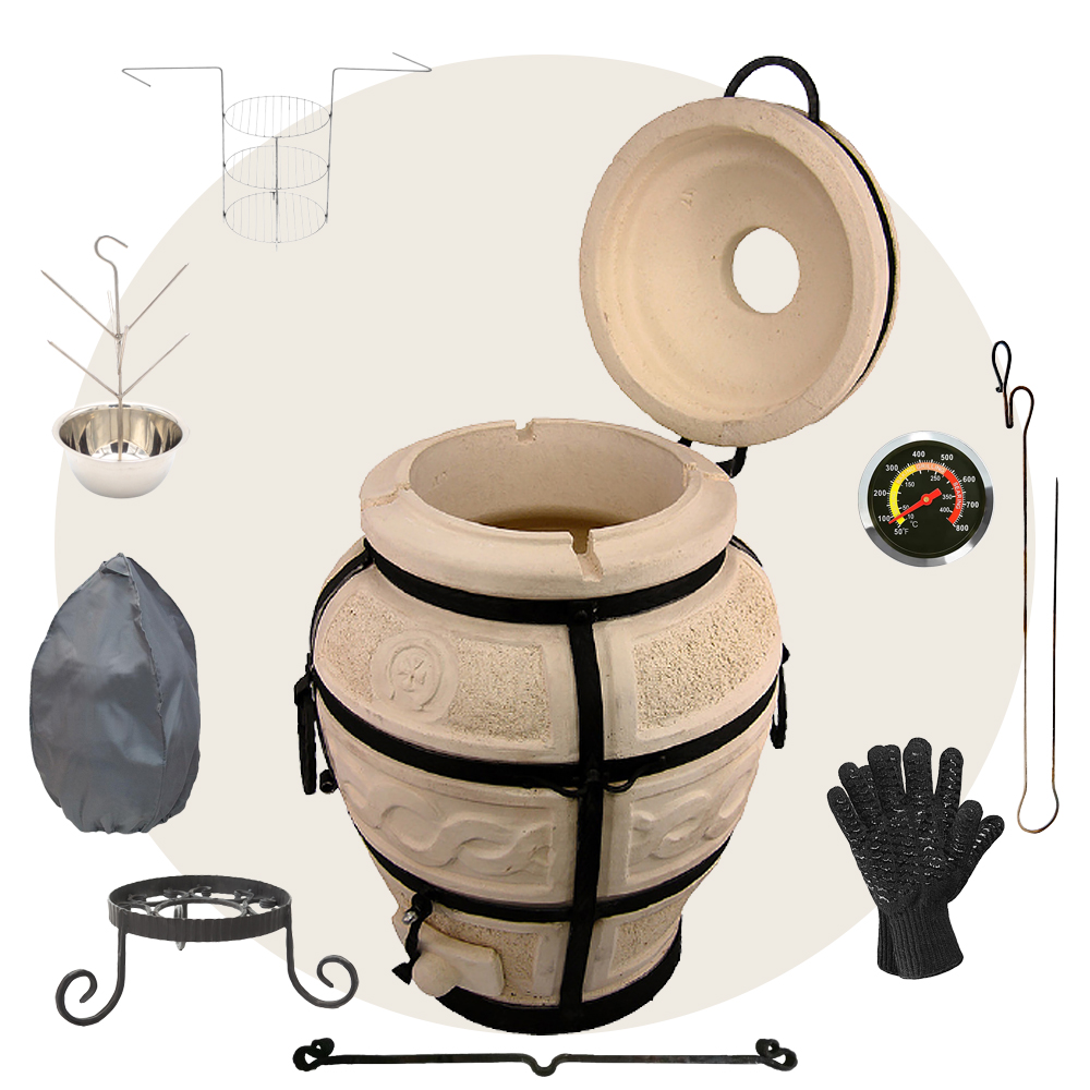 тандыр, шампуры, кочерга, совок, колосник, приспособление для подвешивания шампуров, подставка под тандыр, чехол на тандыр, этажерка 3-х ярусная средняя, ёлочка 21 см с высоким бортом, шампур двойной, перекладина, термометр, перчатки