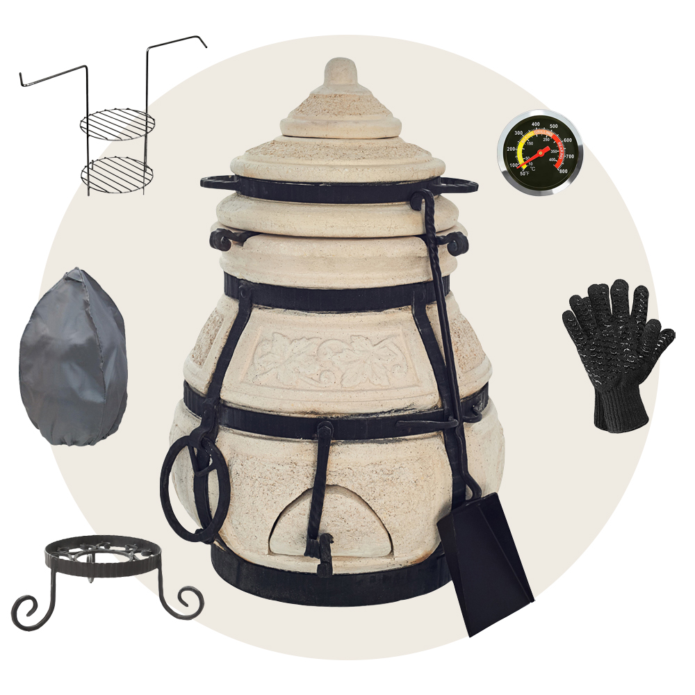 тандыр, шампуры, кочерга, совок, колосник, приспособление для подвешивания шампуров, подставка под тандыр, чехол на тандыр, этажерка 2-х ярусная малая, термометр, перчатки