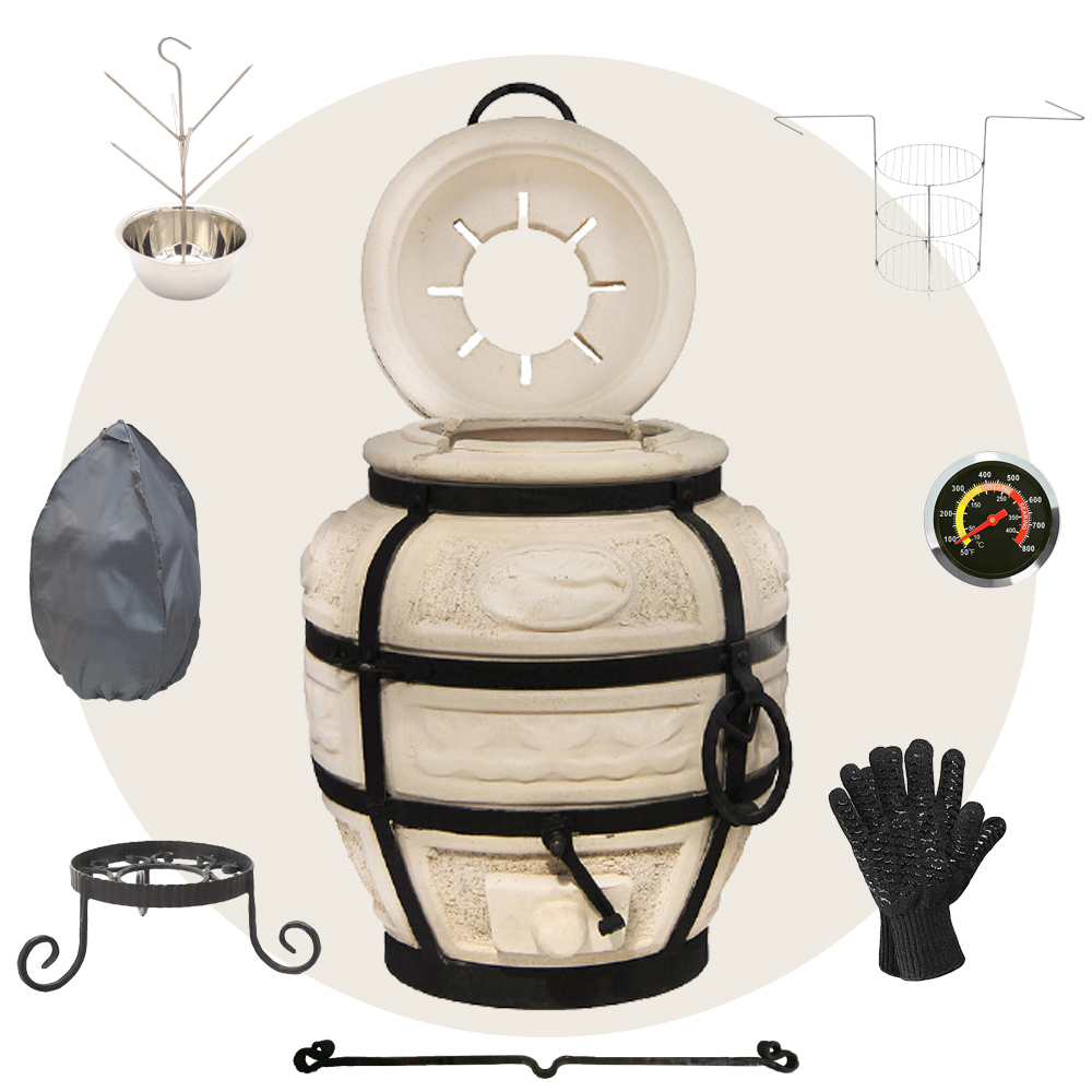 тандыр, шампуры, кочерга, совок, колосник, подставка под тандыр, чехол на тандыр, этажерка 3-х ярусная средняя, ёлочка 21 см с высоким бортом, перекладина, термометр, перчатки