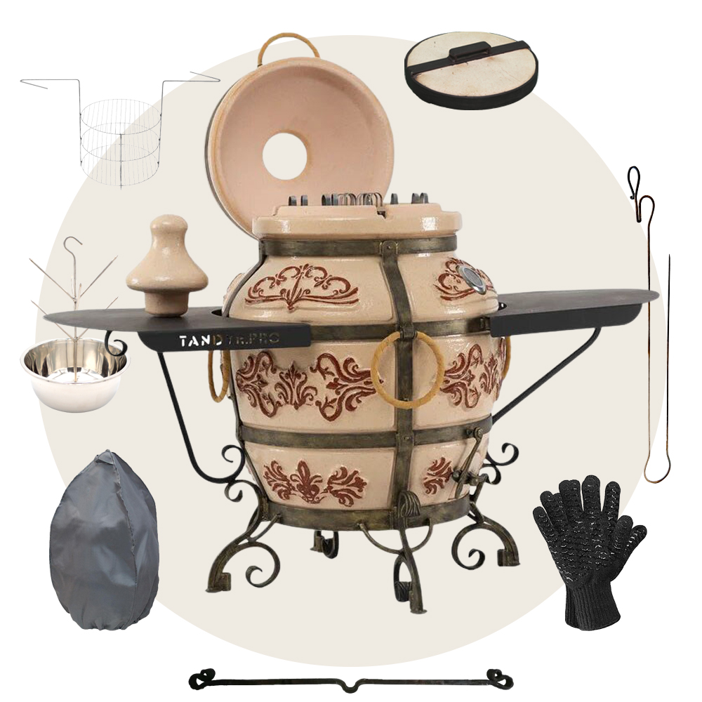 тандыр, шампуры, кочерга, совок, колосник, присп. для подвеш. шампуров, термометр, жароотсекатель, стойка-подставка, столики - 2 шт., чехол на тандыр, этажерка 3-х ярусная большая, ёлочка 28 см с высоким бортом, шампур двойной, перекл. и т.д