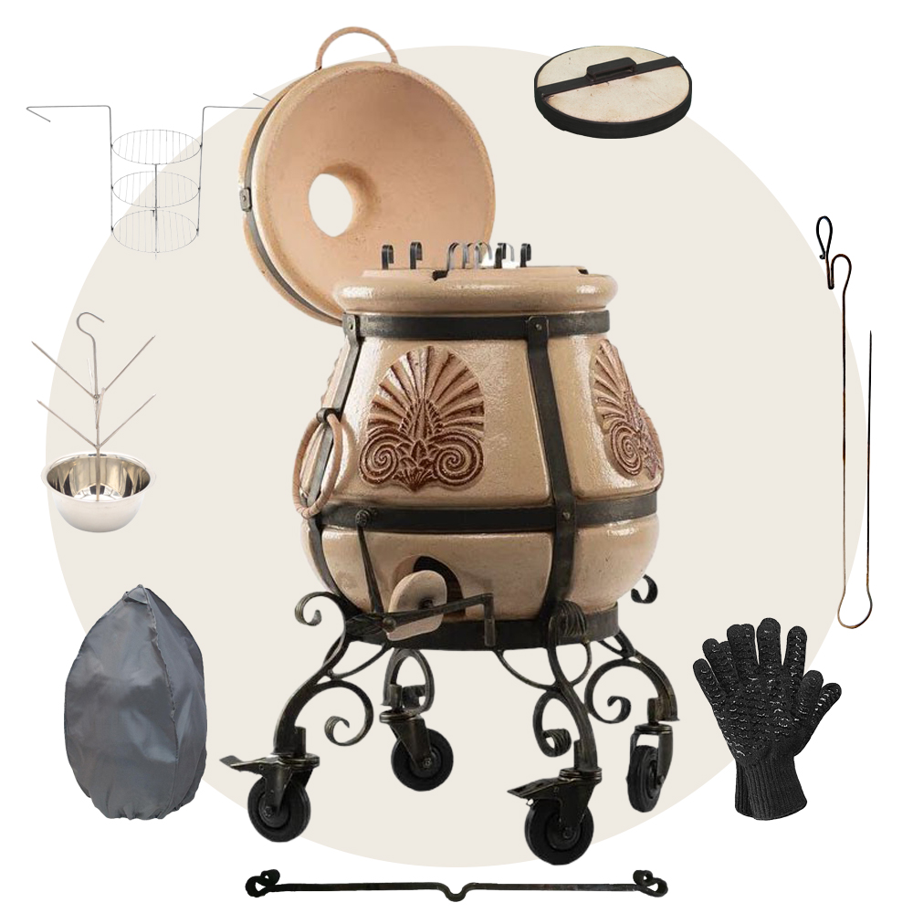 тандыр, шампуры, кочерга, совок, колосник, приспособление для подвешивания шампуров, термометр, жароотсекатель, колёса - 4 шт., чехол на тандыр, этажерка 3-х ярусная средняя, ёлочка 21 см с высоким бортом, шампур двойной, перекл., перчатки